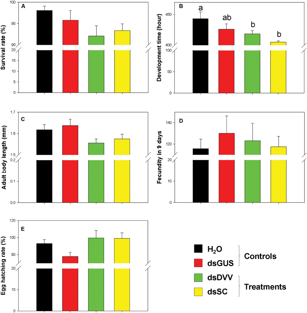 The survival rate and life history traits, including developmental time, fecundity (number of eggs laid), hatching rate of newly laid eggs, and adult body length were measured. Larvae were fed on artificial diets containing dsRNAs for 28 consecutive days. For each replicate, 1.65 μg diet was fed to 10 individuals every other day, so, the average consumption of dsRNA by each individual for 28 consecutive days was 2.31 μg [calculated by (0.83 μg/μg × 1.65 × 14)/10]. Specifically, the number of adults survived at the end of the 28-days feeding test was recorded and the survival rate was calculated for each replicate. Developmental time from egg hatch to maturity was recorded when the first egg appeared. Before transfer to the second egg-laying container, digital photos were taken under magnification and the body length of mature adults was measured from the anterior margin of the head to the end of the posterior abdominal segment. The adults were transferred to a new container and allowed to lay eggs for 9 days. Adults were then removed and fecundity was calculated (indicated by the number of eggs produced in 9 days from the first appearance of eggs). The hatching rate of the above 9 days produced eggs was recorded in another 9 days after adult removal.