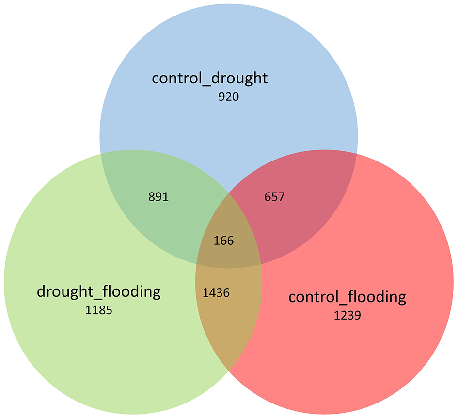 Venn diagram representing the specific and common DEGs across the control vs. drought, control vs. flooding, and drought vs. flooding conditions.