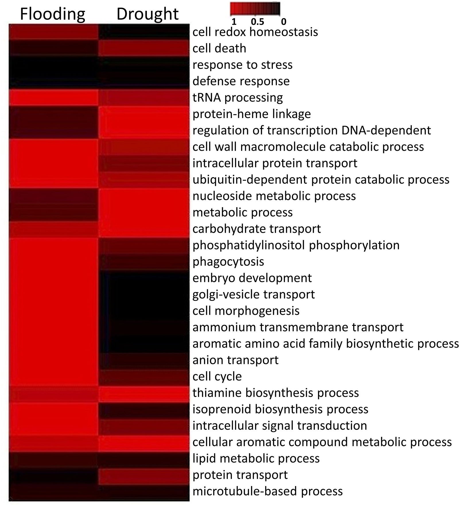The DEGs were annotated for gene ontology (GO) terms (Ashburner et al., 2000) and categorized into Molecular Function (MF), Cellular Component (CC), and Biological Process (BP) categories. A gene enrichment test was then performed on each of the gene lists to obtain the significant terms. Fisher's exact test, which is based on the hypergeometric distribution, was used to calculate the p-value. The TreeView (http://jtreeview.sourceforge.net/docs/overview.html) program was used to draw the heatmap of the significant DEGs in response to drought and flood stress.