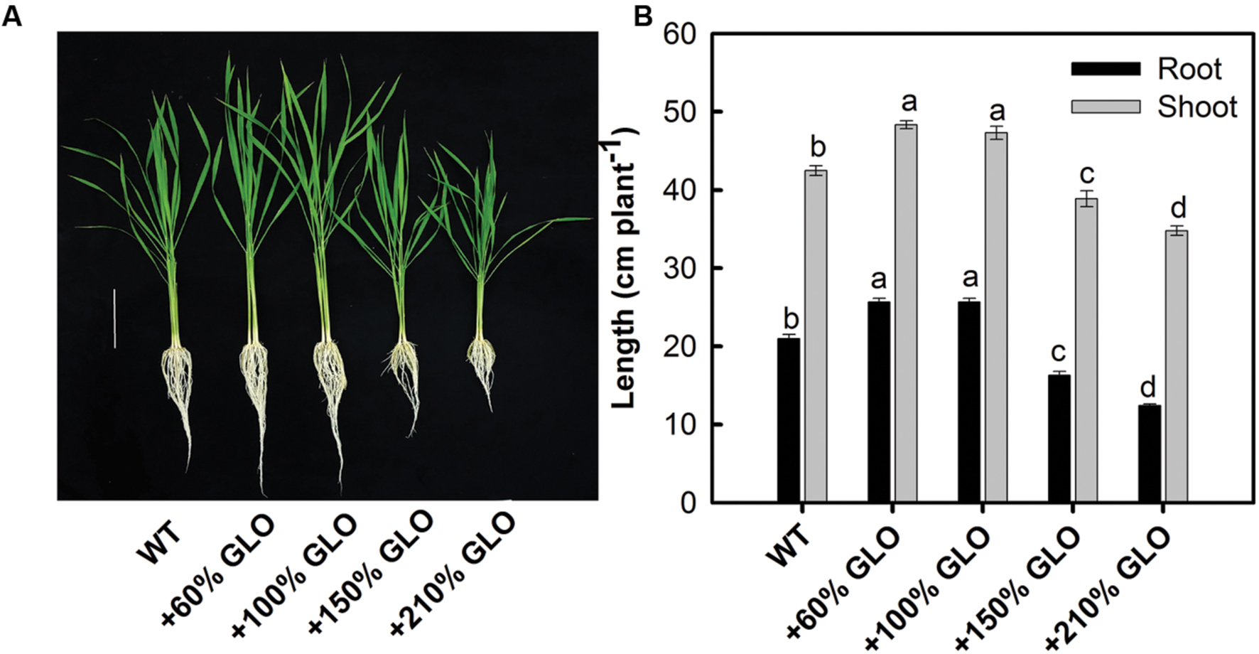 FIGURE 2. Growth phenotypes of the GLO overexpression lines. The plants were grown as described in Figure 1. (A) The picture was taken, and (B) growth of shoot and root was measured when the plants were grown to six-leaf stage. Bar in (A) = 10 cm. The other legends are the same as those in Figure 1.