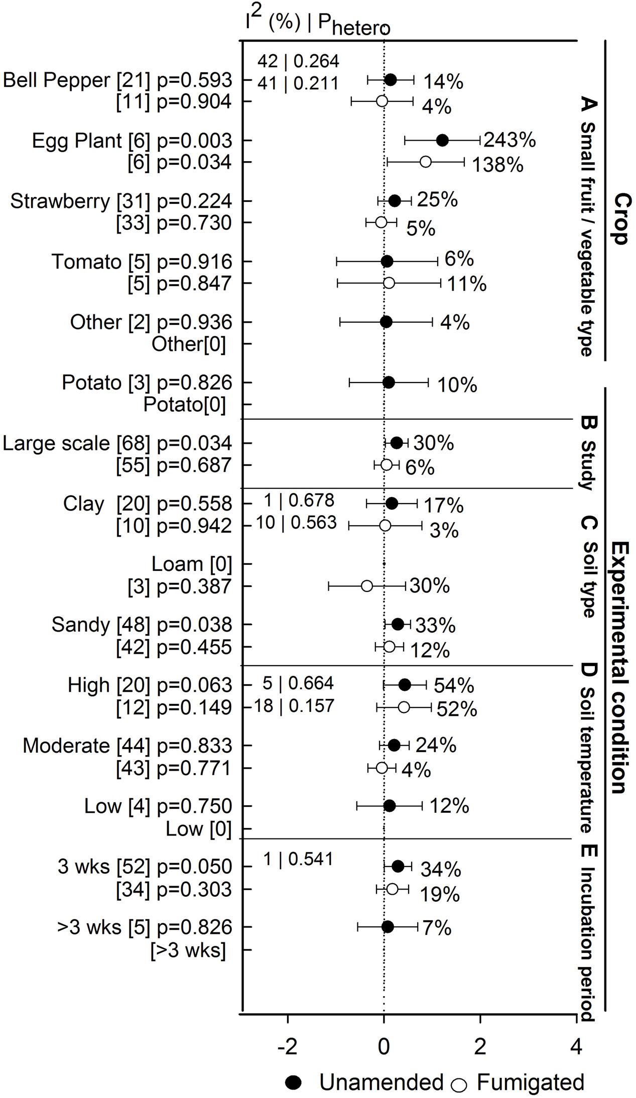 For our analysis, a natural log response ratio (lnR) value below zero indicates suppression of pests (i.e., soil borne pathogens, plant parasitic nematodes and weeds), a value above zero indicates an increase in pests with ASD, and a zero value signifies no effect of ASD treatments on pest suppression. The levels within moderators are considered significantly different from each other or from the overall mean when confidence intervals do not overlap. Heterogeneity (the presence of underlying structure, i.e., true differences among studies) within moderators was characterized by I2 and Phetero. For each pest, we grouped our results as each pest type or crop type, experimental condition and amendment used in ASD. We reported ASD yield response separately for the fumigated control and unamended control.