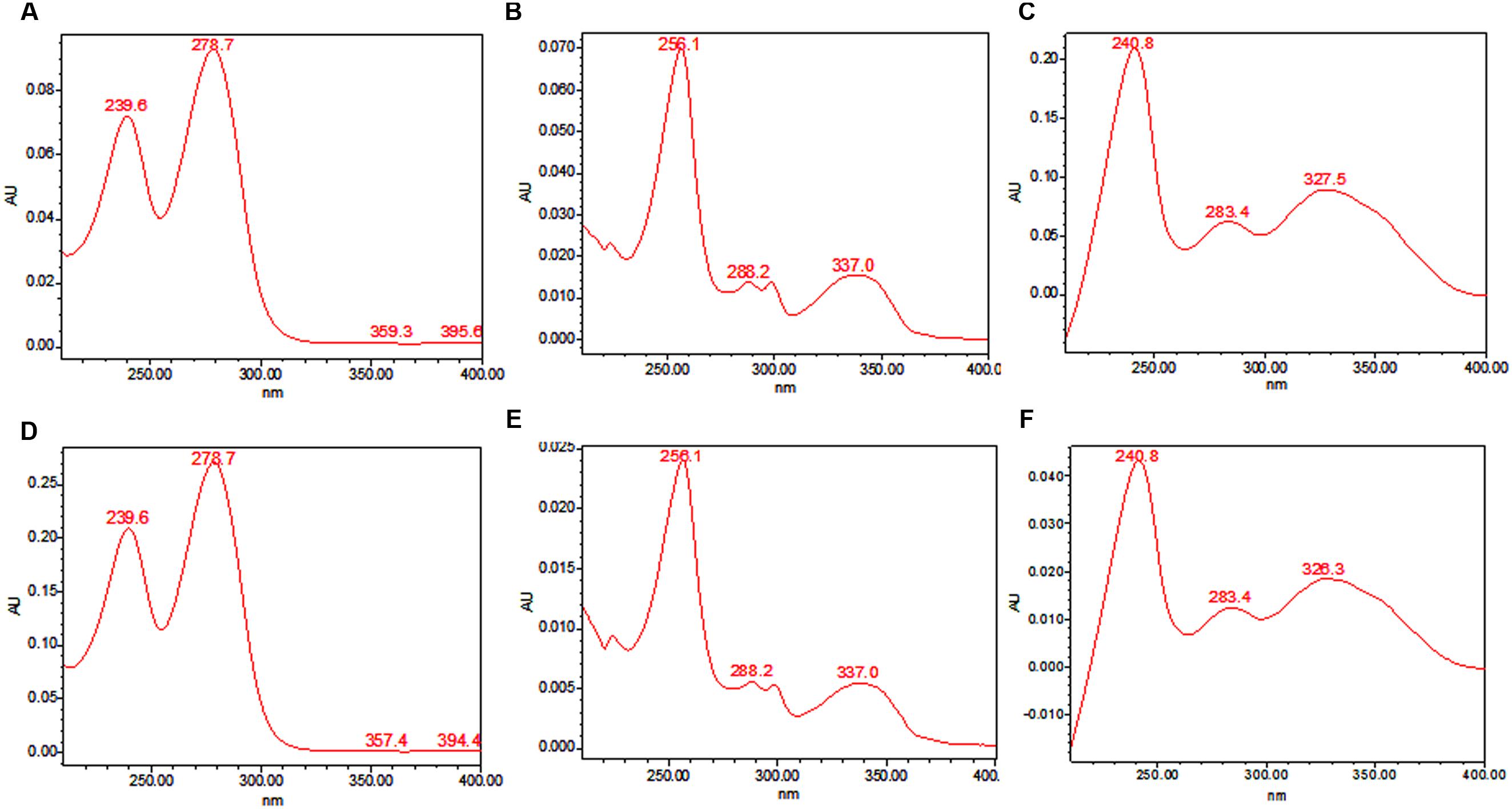 FIGURE 3. UV absorption spectra recorded for standard metabolites and those isolated from A. alternata using HPLC. (A) absorption peaks for standard TeA at 239.6 nm and 278.7 nm, (B) absorption peaks for standard AOH at 256.1, 288.2, and 337.0 nm, (C) absorption peaks for standard AME at 240.8, 283.4, and 327.5 nm, (D-F) absorbance peaks as evaluated from metabolites TeA, AOH, and AME extracted from fungal pathogen.