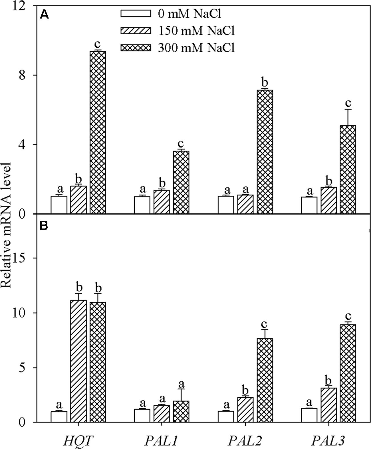 FIGURE 3. Hydroxycinnamoyl-CoA quinate: hydroxycinnamoyl transferase (HQT) and phenylalanine ammonia-lyase (PAL) family gene transcription in the leaves of honeysuckle plants under hydroponic NaCl stress for 15 (A) and 30 (B) days. The PAL gene family consists of PAL1. PAL2, and PAL3. Data are expressed as the means of four replicate experiments (±SD). Different letters on error bars indicate salt-induced significant differences (P < 0.05).