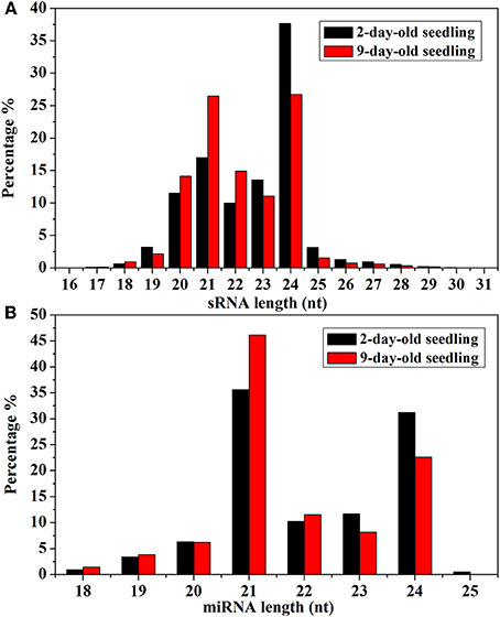 Figure 2. (A) Size distributions of sRNA in 2- and 9-day-old B. alboglabra seedlings. The X axis represented the lengths of sRNA ranging from 16 to 31 nucleotides. The Y axis is the percentage of sRNA at a specific length. Black column: size distribution of sRNA in 2-day-old seedlings; Red column: size distribution of sRNA in 9-day-old seedlings. (B) Size distributions of miRNA in 2- and 9-day-old B. alboglabra seedlings. The X axis represented the lengths of miRNA ranging from 18 to 25 nucleotides. The Y axis is the percentage of miRNA numbers at a specific length. Black column: size distribution of miRNA in 2-day-old seedlings; Red column: size distribution of miRNA in 9-day-old seedlings.