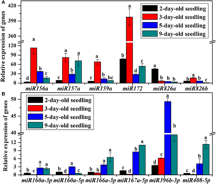 Figure 6. (A) Relative expression of miR156a, miR157a, miR159a, miR172, miR826a, and miR826b in 2, 3, 5, and 9-day-old B. alboglabra seedlings. (B) Relative expression of miR160a-3p, miR160a-5p, miR166a-3p, miR167a-5p, miR396b-3p, and miR408-5p in 2-, 3, 5, and 9-day-old B. alboglabra seedlings. The X axis represented miRNAs analyzed in B. alboglabra The Y axis is the relative expression of miRNAs. Black column: relative expression of miRNA in 2-day-old seedlings; Red column: relative expression of miRNA in 3-day-old seedlings; Blue column: relative expression of miRNA in 5-day-old seedlings; Indigo column: relative expression of miRNA in 9-day-old seedlings. The expressions of miRNAs were calculated relative to those in 1-day-old seedlings. Error bars indicate the SE of three replicates. The differences labeled with different letters were considered significant at p < 0.05.