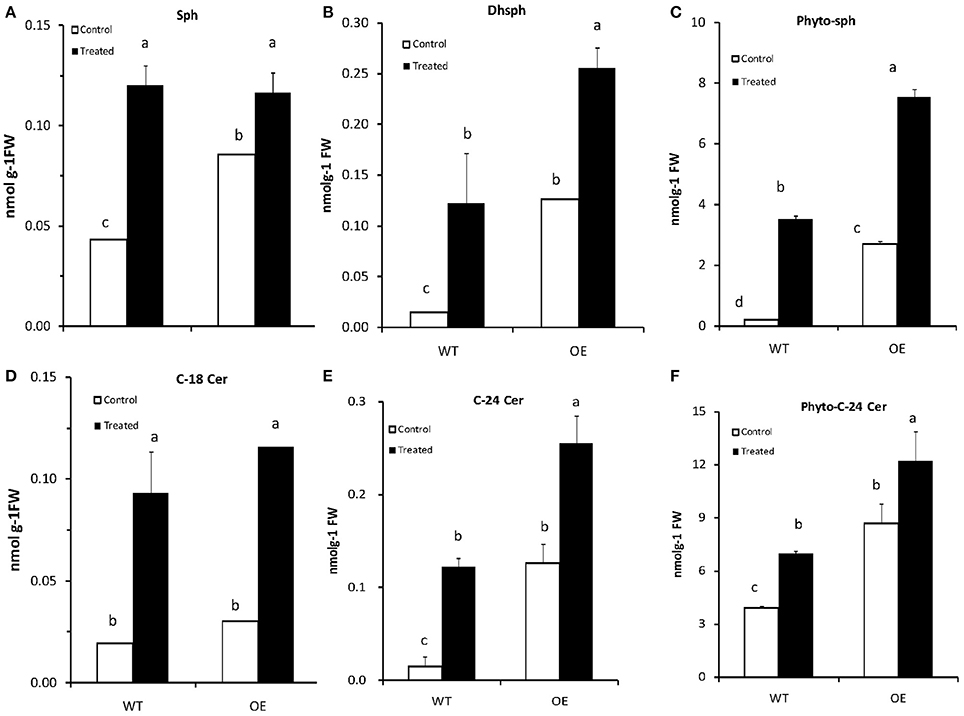 Figure 3. Measurement of sphingolipids in WT and OE plants. (A) Total LCBs and ceramides in indicating plants. (B) Free LCBs composition. (C) LCB moiety distribution of ceramide species. Values represent means ± SE from three independent experiments. Different letters indicate significant differences (P < 0.05) between the treatments.