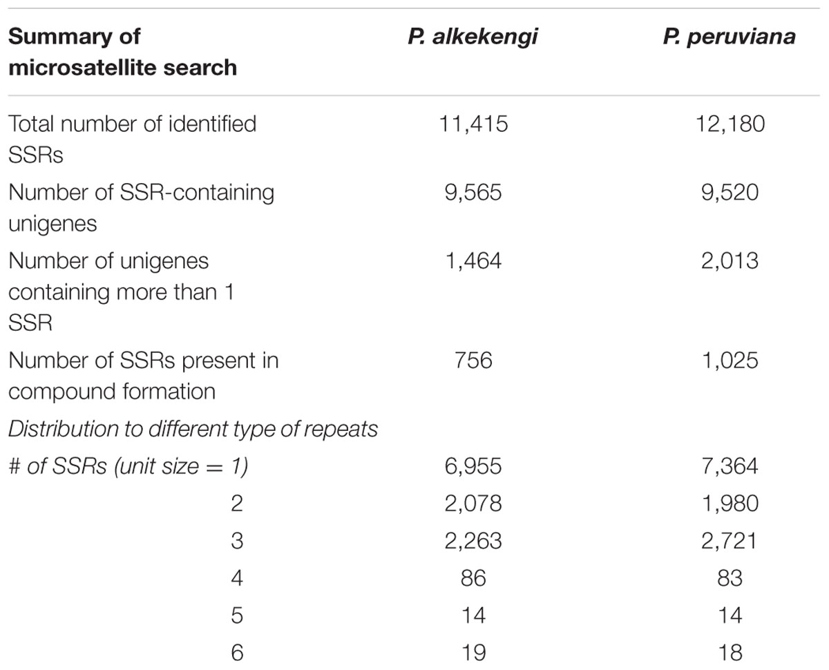 Single sequence repeats SSRs are microsatellites, repetitive DNA sequences in eukaryotes. They are useful markers in population genetics research, genetic map construction, and genetic diversity assessment (for example, see reviews Hancock, 1996; Varshney et al., 2005). To detect and compare SSRs in the two different Physalis species we performed in silico SSR marker identification with MISA (Thiel et al., 2003). We identified 11,415 SSRs in 75,221 transcripts of P. alkekengi and 12,180 SSRs in P. peruviana (Table 2 and Supplementary Data Sheet 4). All SSRs can be classified by their repeat-unit sizes. Mono-nucleotide SSRs represented the largest portion (60.9%) of identified SSRs, followed by tri-nucleotide- (19.8%) and di-nucleotide (18.2%) SSRs. Although only a small portion of tetra- (n = 86), penta- (n = 14), and hexa-nucleotide SSRs (n = 19) were detected in P. alkekengi transcripts, it was significant. P. peruviana sequences showed nearly the same tendency and had more SSRs than P. alkekengi, especially mono- and tri-nucleotide SSRs. There were small numbers of tetra-, penta- and hexa-nucleotide SSRs in our transcriptome sequences from the two species, implying that their base patterns were highly complex. The SSRs of both P. alkekengi and P. peruviana may yield potential genetic markers for a wide range of investigations including population genetics-, comparative genomic-, and gene-based association studies aimed at elucidating the genetic control of important traits.