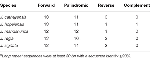 Juglans Cpgs contained numerous forward repeats, palindromic repeats, and reverse repeats of at least 30 bp with a sequence identity ≥ 90% (Figure 4B, Table S5). These “long repeats” ranged from 30 to 44 bp in length and were repeated twice. Protein-coding genes (e.g., rpoC1, psaB, petB, and ycf2) contained a range of five to seven long repeat sequences (across species). Species also varied somewhat for number of long repeat sequences located in the intergenic regions (J. regia n = 24; J. sigillata n = 22; J. hopeiensis n = 21; J. mandshurica, n = 20; J. cathayensis n = 19; Table S5). Depending upon species, we observed 12 or 13 forward repeats, 11 to 16 palindromic repeats, one or two reverse repeats, and one complementary repeat (only seen in J. hopeiensis)(Table 4, Table S5). The longest forward repeat unit was 44 bp; it was located in the psbT-psbN intergenic spacer of the LSC region of J. regia and J. sigillata. A different 44 bp repeat was located in the protein-coding genes psaB-psaA in the LSC of J. cathayensis, J. hopeiensis, and J. mandshurica (Table S5). In the sections Juglans/Dioscaryon, J. sigillata and J. regia each contained 13 forward repeats and two reverse repeats, and 16 (J. regia) or 13 (J. sigillata) palindromic repeats (Table 4, Table S5). In the section Cardiocaryon, J. cathayensis contained 13 forward and 11 palindromic repeats, J. hopeiensis contained 13 forward, 11 palindromic, onereverse, and one complementary repeat, and J. mandshurica contained 12 forward, 12 palindromic, and 1 reverse repeat (Table 4, Table S5). Tandem repeats of more than 20 bp and 100% sequence identity were identified in the intergenic spacers of trnK-UUU-rps16 (one repeat each in J. hopeiensis, J. mandshurica, and J. cathayensis); trnE-UUC-trnT-GGU (J. regia, 1; J. sigillata, 1; J. hopeiensis, 2; J. mandshurica, 1; J. cathayensis, 1); trnT-GGU-psbD (J. regia, 1; J. sigillata, 1; J. hopeiensis, 1; J. mandshurica, 2; J. cathayensis, 1); lhbA-trnG-UCC (J. hopeiensis, 1; J. mandshurica, 1; J. cathayensis, 1); ndhC-trnV-UAC (every Juglans species had one repeat); trnF-GAA-ndhJ (J. regia, 1; J. sigillata, 1); and trnG-UCC-trnfM-CAU (J. regia, 1; J. sigillata, 1). Two identical tandem repeats were found in the protein-coding regions of all five Juglans Cpgs (Table S6).