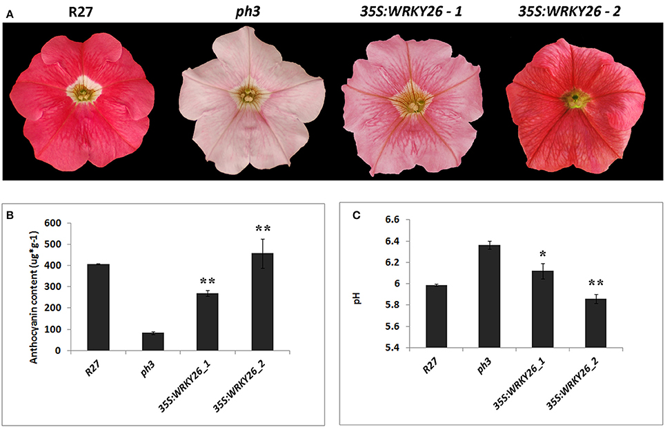 Figure 3. Complementation analysis in ph3 petunia mutant with 35S:VvWRKY26. (A) Phenotype of untransformed flowers of the wild type R27 and mutant ph3 lines compared to transgenic flowers of two lines expressing VvWRKY26. (B) Total anthocyanin content (μg*g−1 fresh weight) of petal limb extracts from untransformed R27 and ph3 lines and transgenic plants determined by spectrophotometry at 540 nm. Purified malvidin 3-glucoside was used as a standard. Data represent the mean of three biological replicates ± SE. Asterisks indicate significant difference against the ph3 mutant line (**P > 0.01). (C) The pH values of crude petal limb extracts from untransformed R27 and ph3 lines and transgenic plants. Each pH value is the mean of 10 biological replicates ± SE. Asterisks indicate significant difference against the ph3 mutant line (*P > 0.05; **P > 0.01).