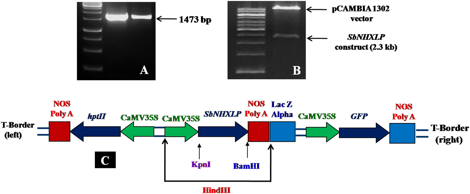 SbNHXLP gene isolation and construction. (A) isolation of SbNHXLP (1473 bp), (B) gene construct and vector, (C) recombinant vector map of pCAMBIA1302-SbNHXLP. SbNHXLP, Sorghum bicolor Na+/H+ antiporter-like protein; hptII, hygromycin; CaMV35S, Cauliflower mosaic virus 35S promoter; nos, nopaline synthase terminator.