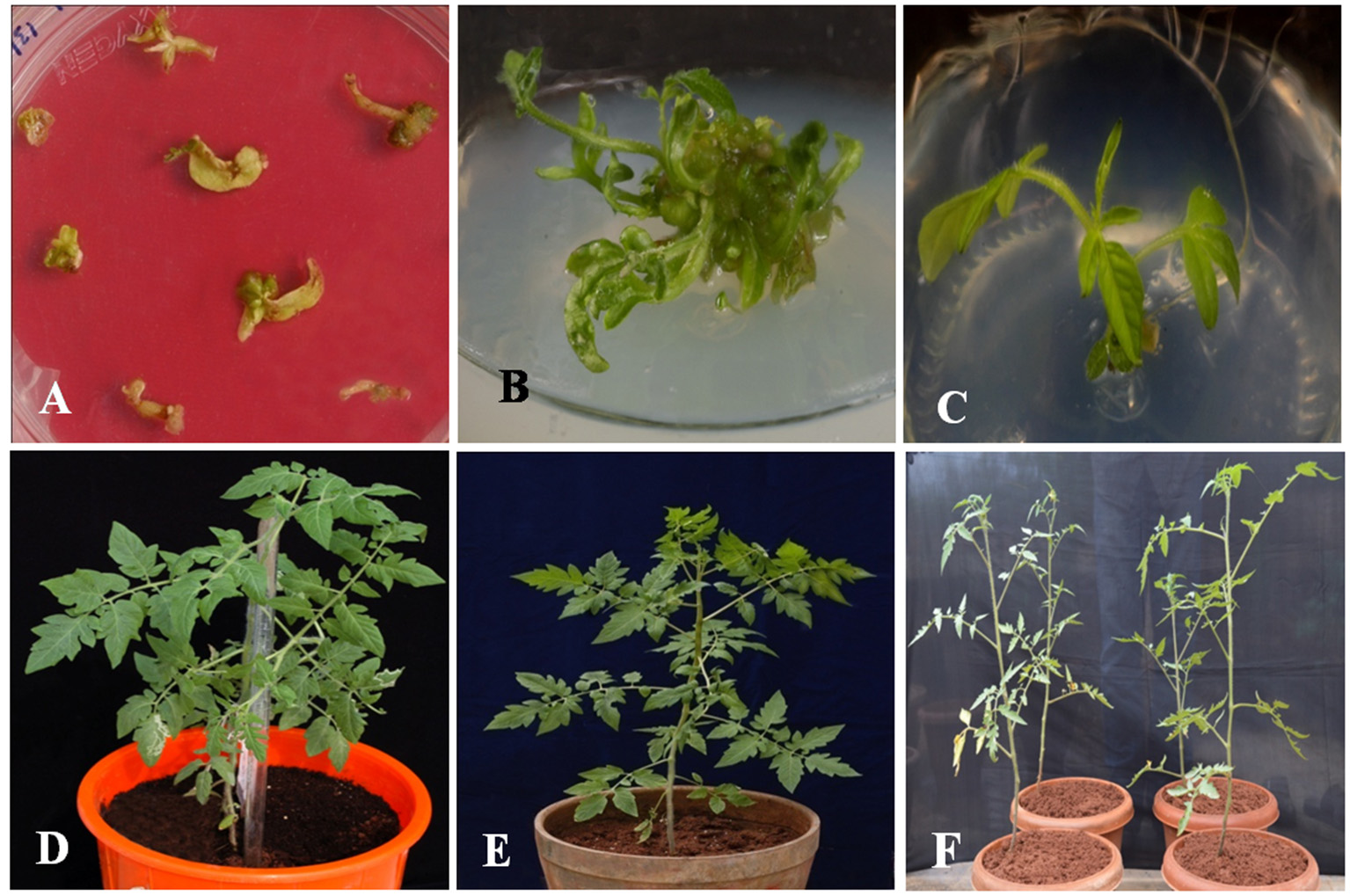 Different developmental stages of in vitro transformants. (A) regeneration of putative transgenic shoots from cotyledonary and hypocotyl explants on 2 mg/L TDZ and 3 mg/L hygromycin medium, (B) multiple shoot regeneration on 2 mg/L TDZ, (C) rooting of transformants with elongated multiple shoots on 3 mg/L hygromycin medium, (D) hardening of the transformant in coco-peat, (E) acclimatized transgenic in the garden soil, (F) putative transformants growing in green house.