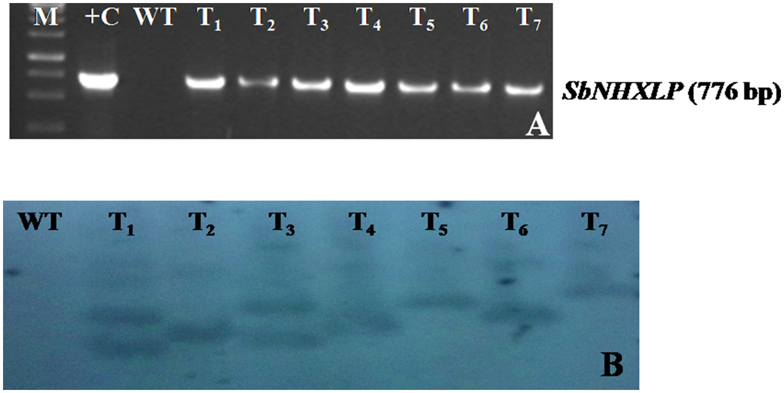 Molecular characterization of transgenics. (A) SbNHXLP PCR, (B) gene copy number by Southern blot analysis of genomic DNA digested with HindIII and probed with hptII sequence. M, molecular marker of 1 kb; +C, SbNHXLP, Sorghum bicolor Na+/H+ antiporter-like protein; pCAMBIA1302-SbNHXLP plasmid; WT, wild-type; T1,T2,T3, T4, T5, T6, and T7 transgenic lines.