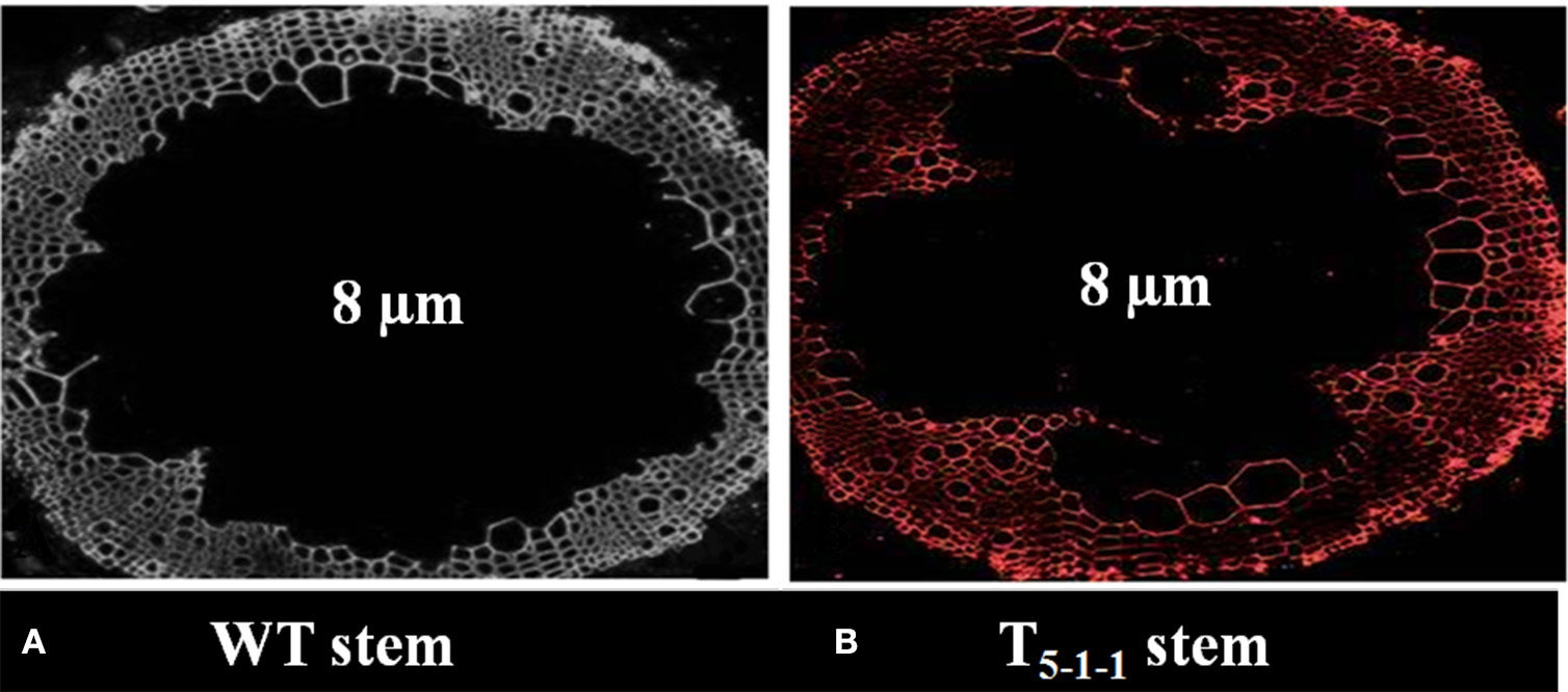 Immunolocalization of SbNHXLP protein. (A) absence of fluorescence in WT stem, (B) presence of fluorescence in T5−1−1 stem. Fluorescence signals were emitted at the plasma membrane as revealed by using NHX antibodies conjugated with Alexafluor antibodies at 578 nm. WT, wild-type plant.