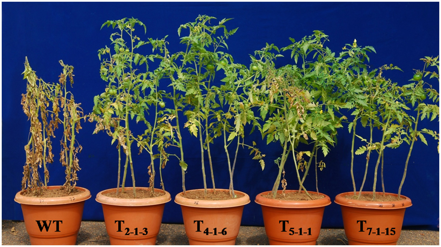 Evaluation of transgenic tomato plants expressing SbNHXLP gene along with WT. Forty-five-day-old plants were subjected to 200 mM NaCl for 15 alternate days. WT, wild-type; T2−1−3, T4−1−6, T5−1−1, and T7−1−15, transgenic lines.