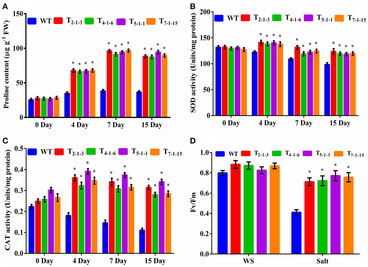 Evaluation of transgenics under salt stresses. (A) proline content, (B) SOD activity, (C) CAT activity, (D) chlorophyll fluorescence. Forty-five-day-old plants were subjected to 200 mM NaCl (salt stress) for 15 consecutive days. In each independent experiment, 5 plants were used. For chlorophyll fluorescence, 45-day-old plants were treated with 200 mM NaCl for 3 consecutive days. In each independent experiment, 2 plants were used. The mean and SE from three independent experiments are shown. *Indicates significant differences in comparison with the WT at p < 0.05. WT, wild-type; T2−1−3,T4−1−6, T5−1−1, and T7−1−15, transgenic lines. FW, fresh weight; Fv/Fm, chlorophyll fluorescence; WS, wothout stress.