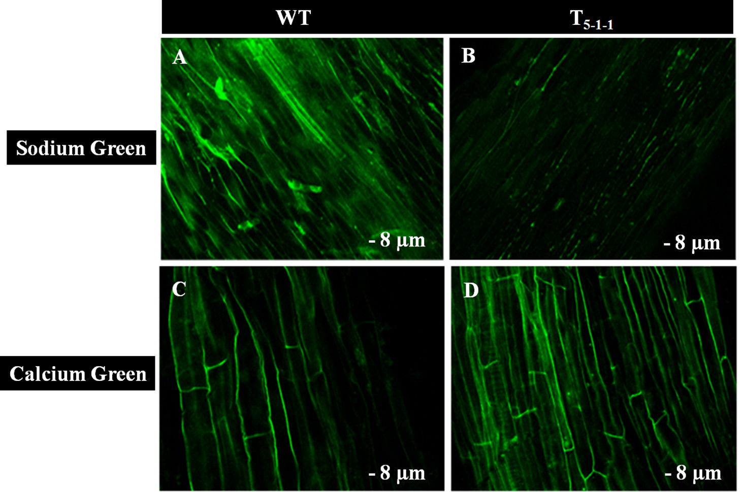 Confocal images of Sodium Green and Calcium Green indicators in WT and T5−1−1 transgenic roots. (A) Sodium Green fluorescence in WT root, (B) Sodium Green fluorescence in T5−1−1 root, (C) Calcium Green fluorescence in WT root, (D) Calcium Green fluorescence in T5−1−1 root. Nine-day-old seedlings were treated with 200 mM NaCl for 2 h. Root sections (8 μm) were incubated with 10 mM Sodium Green and Calcium Green solutions separately. After 1 h incubation, samples were observed under confocal microscope. WT, wild-type.