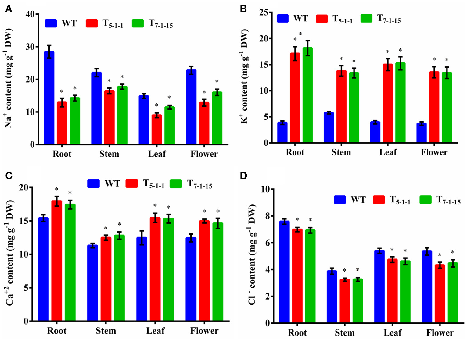Ion analysis of T5−1−1 and T7−1−15 transgenic lines. (A) Na+, (B) K+, (C) Ca2+, (D) Cl− content. Na+, K+, Ca2+, and Cl− ion levels in root, stem, leaf, and flower tissues were estimated. In each independent experiment, 2 plants were used. The mean and SE from three independent experiments are shown. *Indicates significant differences in comparison with the WT at p < 0.05. WT, wild-type; T5−1−1 and T7−1−15,transgenic lines; DW, dry weight.