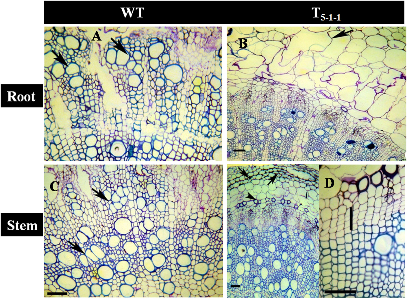 Anatomical transverse section of T5−1−1 transgenic line and WT treated with 200 mM NaCl. Transverse sections showing vascular tissues in (A) WT root, (B) T5−1−1 root, (C) WT stem, (D) T5−1−1 stem. WT root shows the occurrence of thick walled multiple vessels (arrows). In T5−1−1 root, radially elongated, loosely organized inner cortical cells with large intercellular spaces are seen. Arrow head indicates formation of lysigenous cavities in the cortex. WT stem shows high vessel density and thin walled fibers in the secondary xylem with the arrangement of vessels in tangential multiples (arrows). Secondary xylem of the T5−1−1 stem shows the distribution of solitary vessels with wide lumen and thick walled fibers. Arrows indicate the collenchymatous outer cortex. Enlarged view of T5−1−1 stem shows 3–4 layered cambial zones (vertical bar). Scale bar = 50 μm. WT, wild-type.