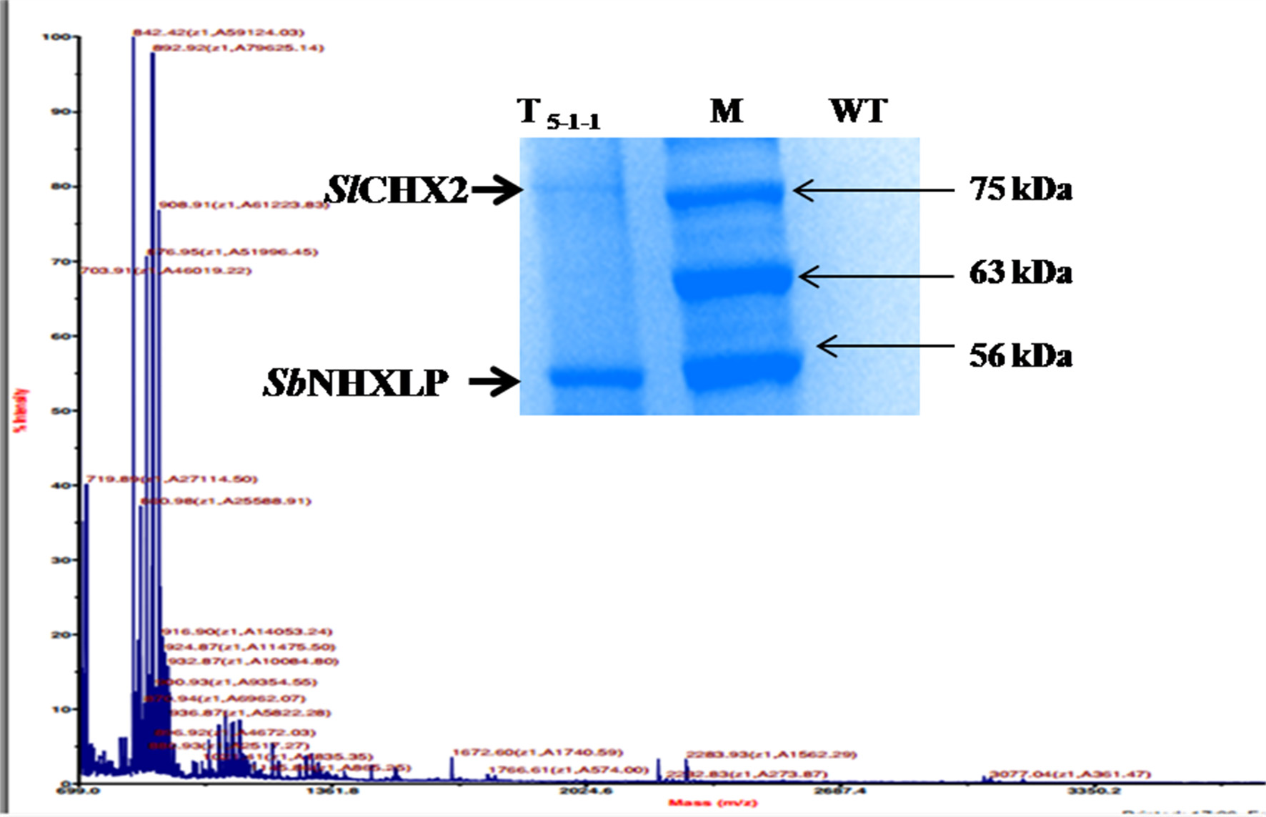 Co-immunoprecipitation and MS-MS analysis. MS-MS analysis of CHX2. SbNHXLP-CHX2 complex was detected in immunoprecipitate of root extracts captured by anti-NHX antibody when electrophoresed with SDS-PAGE (insert).