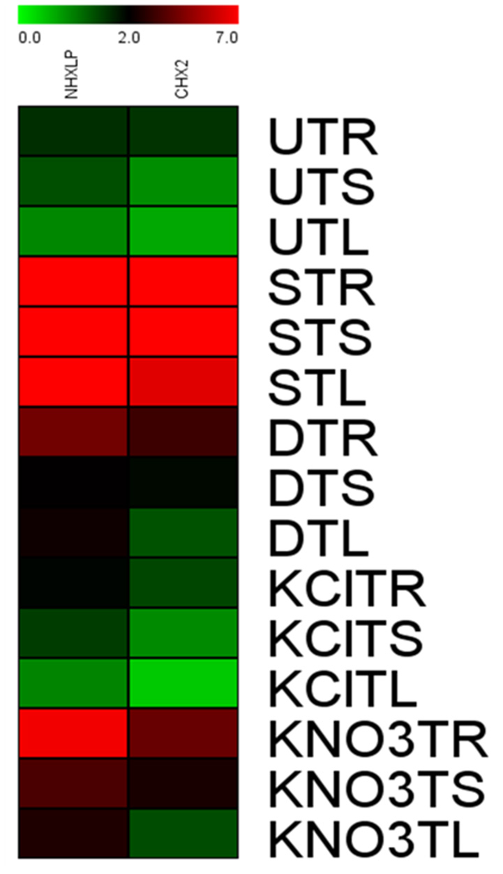 Relative expression of SbNHXLP, and SlCHX2 at the transcript level is shown in different tissues. Relative expression of SbNHXLP, and SlCHX2 are shown during different stress conditions in comparison to its control as revealed by quantitative RT-PCR analysis. Values represent the expression values obtained after normalizing against control value. All samples were analyzed in triplicates, in two independent experiments. Names on the horizontal axis indicate the genes, and the vertical axis represent the tissues, i.e., UTR, untreated transgenic root; UTS, untreated transgenic stem; UTL, untreated transgenic leaf; STR, salt-treated transgenic root; STS, salt-treated transgenic stem; STL, salt-treated transgenic leaf; DTR, drought-treated transgenic root; DTS, drought-treated transgenic stem; DTL, drought-treated transgenic leaf; KClTR, potassium chloride-treated transgenic root; KClTS, potassium chloride-treated transgenic stem; KClTL, potassium chloride-treated transgenic leaf; KNO3TR, potassium nitrate treated transgenic root; KNO3TS, potassium nitrate-treated transgenic stem; KNO3TL, potassium nitrate-treated transgenic leaf. Each color represents the relative expression levels. Salt, 200 mM NaCl; drought, 200 mM mannitol; KCl, 10 mM KCl, and KNO3, 100 mM KNO3.