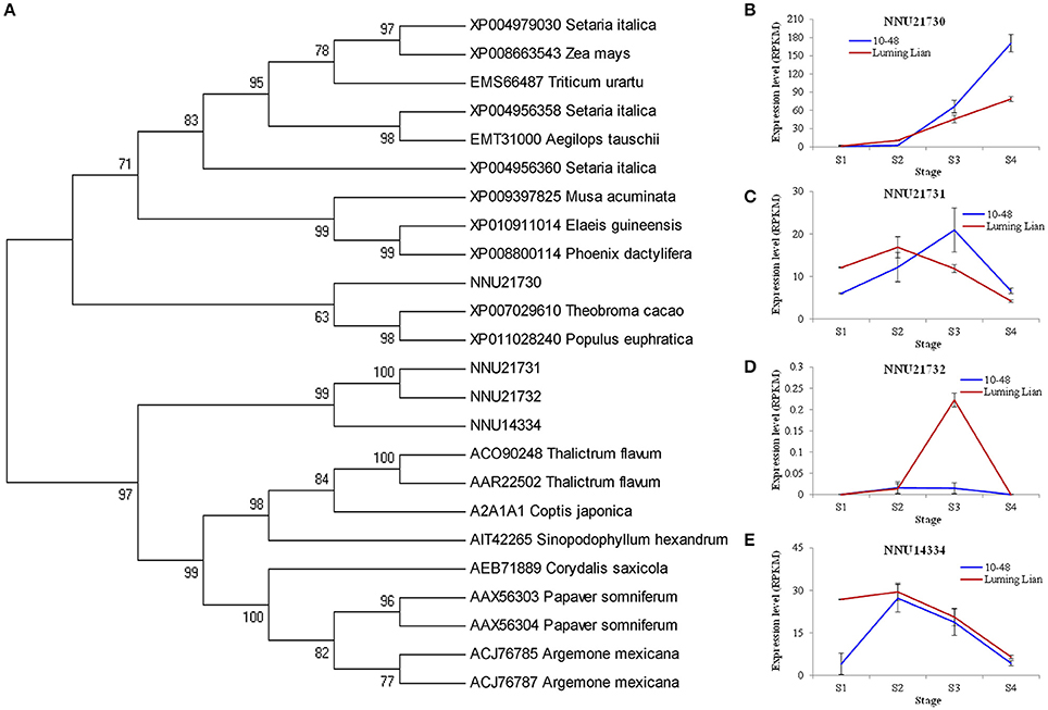 Figure 6. Phylogenetic relationship of norcoclaurine synthase (NCS) for different species based on protein sequence (A) and the expression of four lotus NCS genes at four developmental stages in two lotus cultivars (B–E). In (A), the value at each node is the bootstrap support value from 1000 replicates. In (B–E), RPKM value for each gene used three biological replicates; the error bars indicate standard error (n = 3).