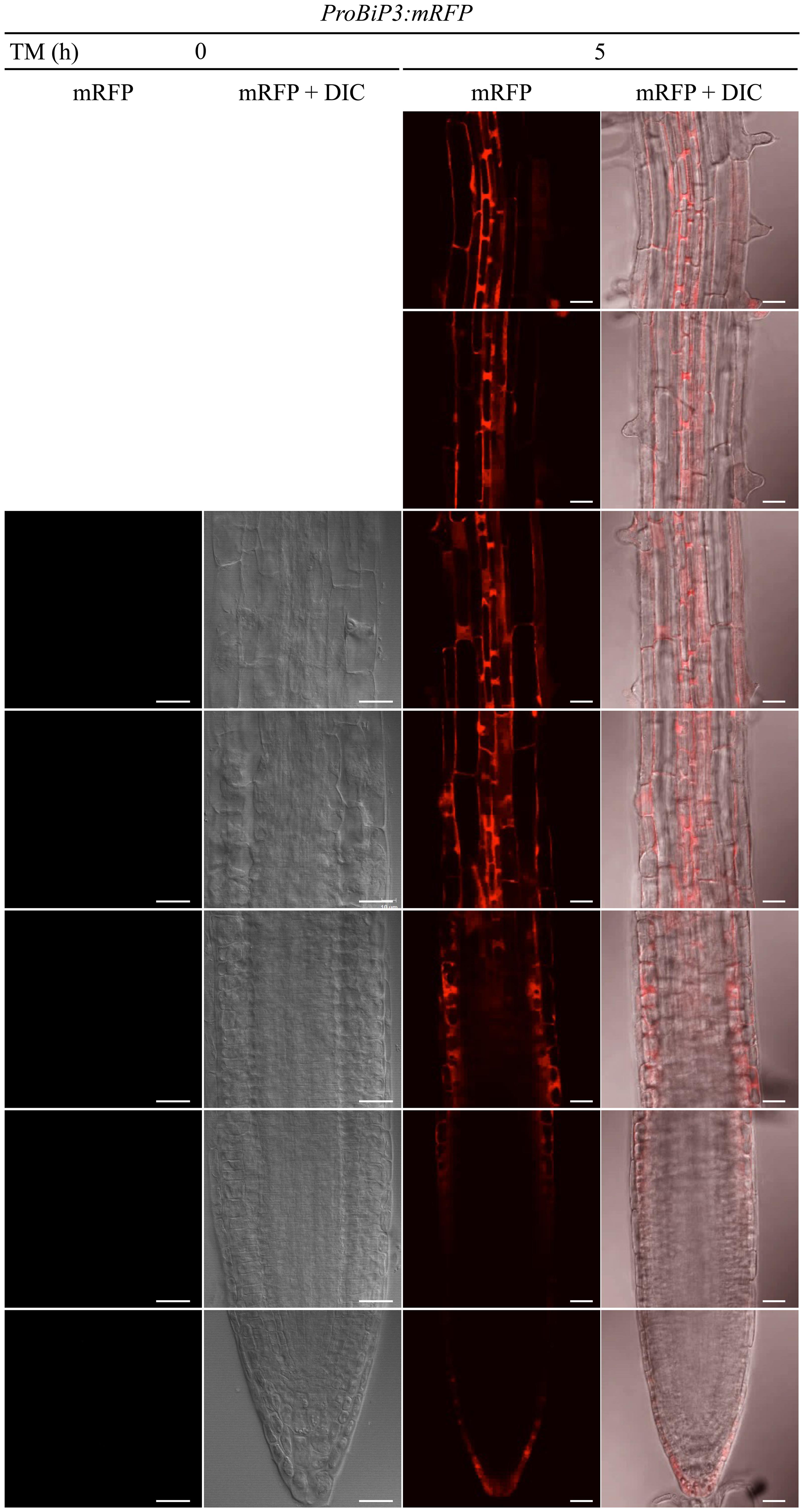 FIGURE S3 | Spatiotemporal ER stress response in Arabidopsis roots. Observation of the ProBiP3:mRFP signal in roots of 7-day-old seedlings treated with 5 μg/ml TM for the time indicated. Merged images of mRFP fluorescence and DIC are shown. The fluorescent images were provided at the left side of each merged image. Scale bars, 10 μm.