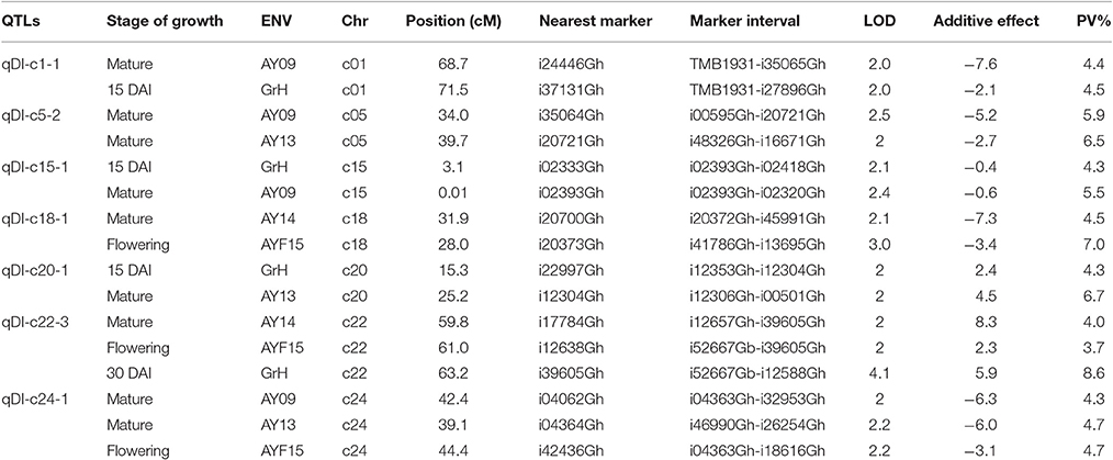 All the DI QTLs explained the observed PVs from 3.7 to 12.2% (Supplementary Table 2). Seven of the DI QTLs were consistently identified in at least two environments were designated as stable ones. Among them, four QTLs, qDI-c1-1, qDI-c15-1, qDI-c20-1, and qDI-c22-3 were identified both in greenhouse tests and field investigations with 4.4–4.5%, 4.3–5.5%, 4.3–6.7%, and 3.7–8.6% of the observed PV explained, respectively; the remaining three QTLs, qDI-c5-2, qDI-c18-1, and qDI-c24-1 were identified only in field investigations with 5.9–6.5%, 4.5–7%, and 4.3–4.7% of the observed PV explained, respectively. Two stable DI QTLS were mapped on At sub-genome while five on Dt sub-genome. Five stable DI QTLs have favorable alleles from sGK9708 while two from 0 to 153 (Table 3). Two QTLs identified only in one environment on c18, qDI-c18-2 and qDI-c18-3 also give a high explanation to the observed PV of 10 and 12.2%, respectively. There were no common QTLs detected between the two DAIs and QTLs of different DAI do not share a common chromosome region. Most of the DI QTLs detected in this study were tightly linked to the SNP markers; however, nine of them were linked to the SSR markers (Supplementary Table 2).