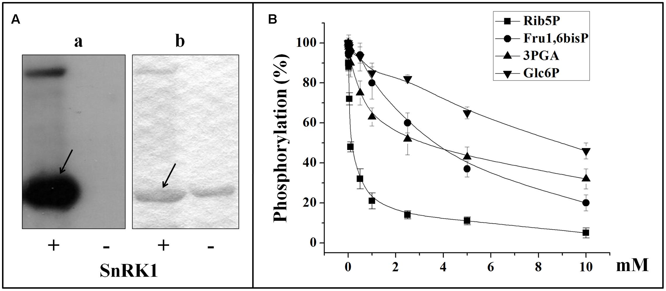 FIGURE 2. In vitro phosphorylation of recombinant TaeNAD-GAPDH by a SnRK1 purified from wheat seed. (A) NAD-GAPDH radioactivity incorporation from the [32P]ATP after phosphorylation by the purified SnRK1 resolved by SDS-PAGE and revealed by storing phospho-screen exposure and scanning with the TyphoonTM system (a) or stained with Coomassie Blue (b). Arrows indicate the migration of NAD-GAPDH. (B) Schematic representation of NAD-GAPDH phosphorylation by SnRK1 under the presence of different concentrations of Rib5P, Fru1,6bisP, 3PGA, or Glc6P. For schematic representations NAD-GAPDH phosphorylation (%) values were calculated from autoradiography using LabImage Version 2.7.0 (free edition) and all data are means of three independent experiments and reproducible with differences below ± 10%.