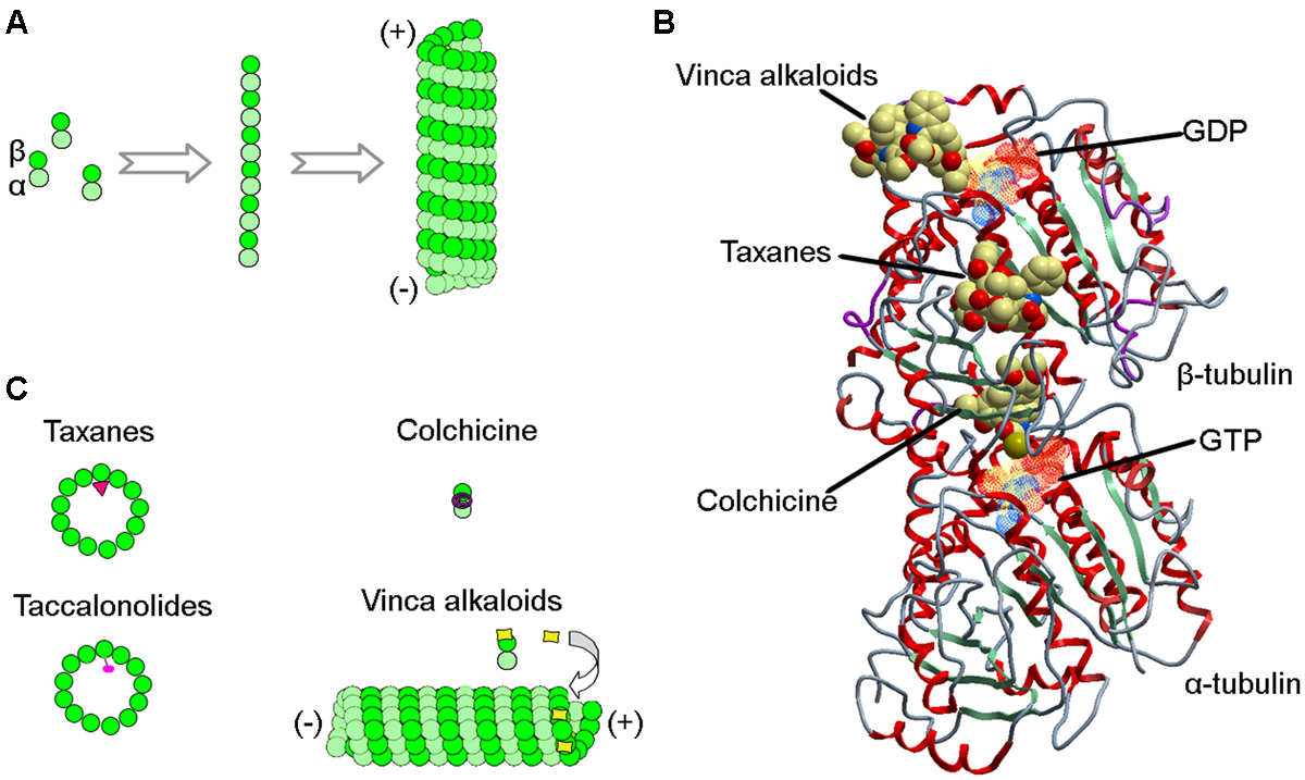 Interactions of MTAs with microtubules. (A) During microtubule polymerization, α/β-tubulin heterodimers assemble head-to-tail to generate protofilaments, which form lateral connections to build the hollow structure of the microtubule. (B) Structure of the α/β-tubulin heterodimer showing binding sites for taxanes, vinca alkaloids, colchicine, GDP, and GTP. (C) Schematics showing how taxanes, vinca alkaloids, colchicine, and taccalonolides are incorporated into microtubules or α/β-tubulin heterodimers.