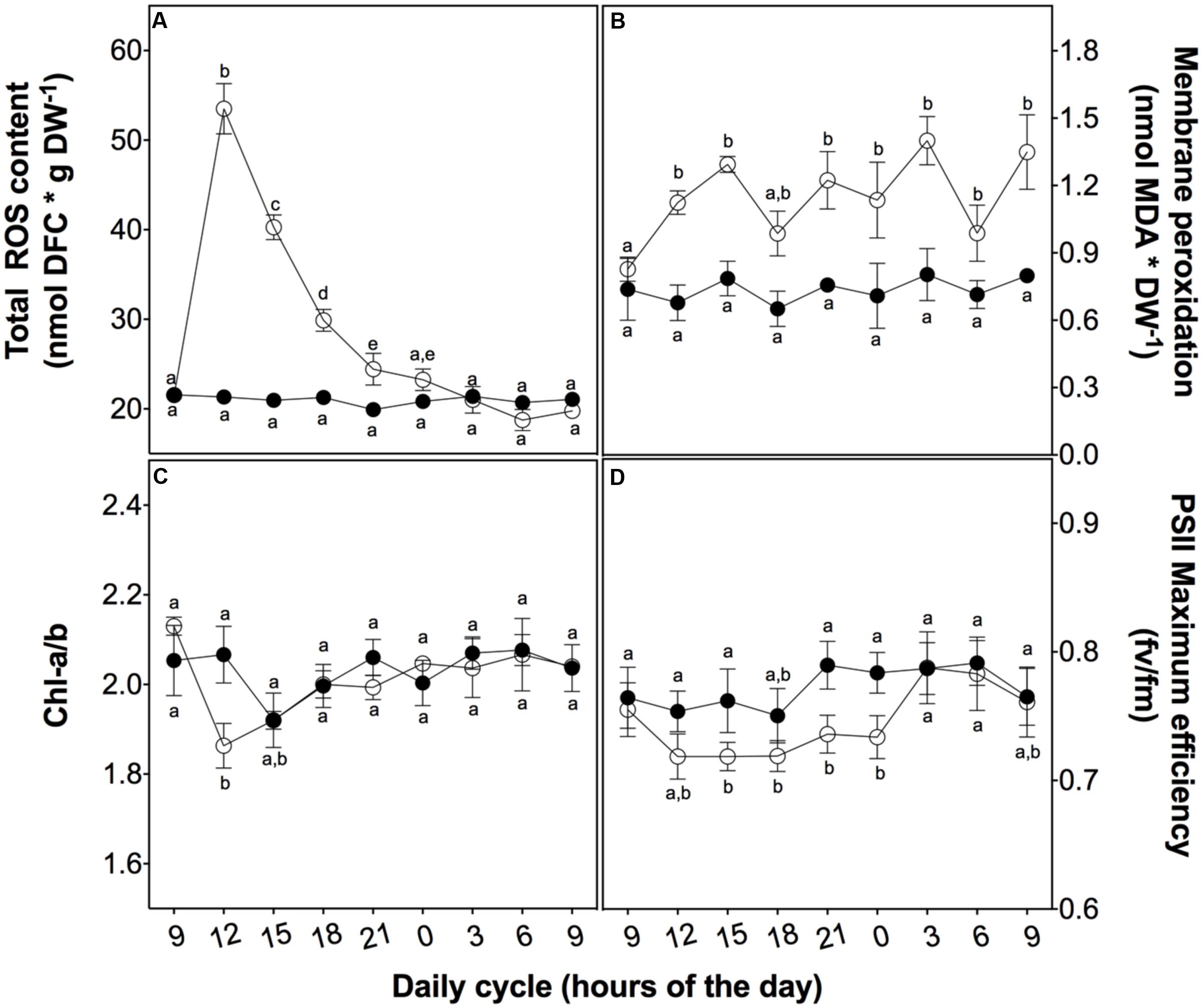 FIGURE 3. Effect of UVB radiation on physiological parameters in D. antarctica plants grown ex vitro. (A) Total ROS content. (B) Membrane peroxidation (thiobarbituric acid reactive substances). (C) The ratio of chlorophyll a and b. (D) Photosynthetic efficiency of PSII. Open circles represent means (±standard error of the mean; N = 3) of plants that underwent the UVB treatment and closed circles represent the control means (±standard error of the mean; N = 3). Significant differences between treatments are indicated by letters (∗P < 0.05).