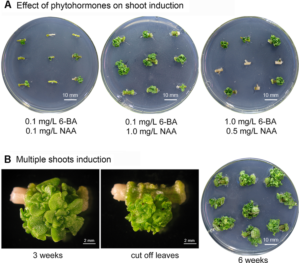 Induction of multiple Sedum alfredii shoots. (A) Stem explants grown on medium containing various concentrations of 6-BA and NAA. (B) Multiple shoots induced on medium containing 0.1 mg/L 6-BA and 1.0 mg/L NAA.