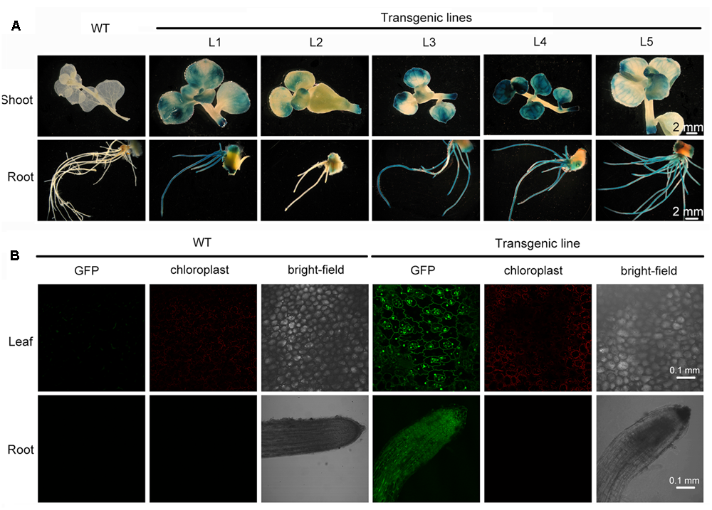 Sedum alfredii and S. plumbizincicola can easily be made to reproduce asexually or by vegetative propagation. Shoots of putative transgenic plants were removed and cultured for rooting in hydroponic medium containing 1/4 MS basal salts for 1 week. After vegetative propagation, well-rooted plants were randomly selected and transformation was verified by GUS staining analysis. All five of the selected lines stained intensely blue in leaf, stem, and root tissue. Conversely, no blue coloration was observed in wild-type plants (Figure 4A), indicating that the gusA gene had stably integrated into the transformed plants’ genome and was functional. The intensity of GUS staining varied among the lines (Figure 4A) possibly due to the different locations or copy numbers of the transgene influencing its expression level in the transformants. Another reporter gene, GFP, was introduced by Agrobacterium-mediated transformation into S. alfredii explants. GFP expression was observed in leaf and root cells of transgenic plants (Figure 4B), whereas no GFP fluorescence was detected in non-transformed wild-type plants (Figure 4B).