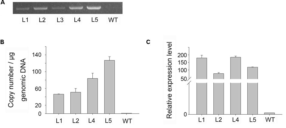 Molecular analysis of transgenic plants. (A) PCR analysis of genomic DNA for the gusA gene in putative transgenic, and WT, plants. (B,C) Real-time PCR analysis of genomic DNA for gusA gene copy number (B) and of cDNA for gusA gene expression level (C).