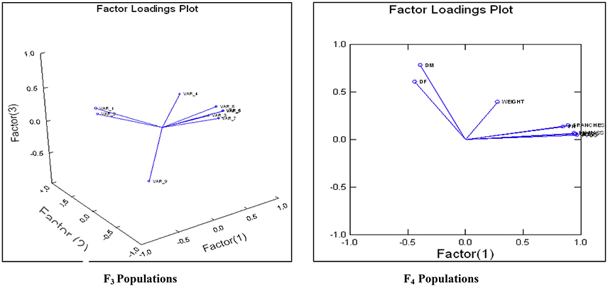The means were adjusted using online software package for augmented block design developed by Rathore et al. (2004). Before undertaking statistical analysis on the basis of adjusted pooled mean values, homogeneity of variance was tested as suggested by Levene (1960). The quantitative characters were further analyzed for various statistical parameters viz. range, mean, coefficient of variation, fruitful heterosis, and principal component analysis (PCA) using the statistical software SYSTAT-12. Phenotypic and genotypic coefficients' of variation (PCV and GCV) for different traits were calculated as PCV = √VP/ mean × 100, GCV = √VG/mean × 100 as per Burton (1952). Heritability (narrow sense) was estimated as h2 (ns) = √A/VP × 100 as per Lush (1940). Expected genetic advance was calculated as EGA = k × VG/VP × √VP as per procedure of Johnson et al. (1955). Here, k = 2.06 (standard value assumed at 5% selection intensity); VG is genotypic variance and VP is phenotypic variance. The numerical data were also subjected to biometrical analysis using SAS software (SAS/Stat, 2011). However, fruitful heterosis (HF) coined by Koseoglu et al. (2017) were also estimated over better parent (BP) for selecting superior progeny in both F3 and F4 generations as: HF (%) = [(F3 and F4-BP)/BP] × 100%, where, BP is the mean value of the better parent of a particular cross.