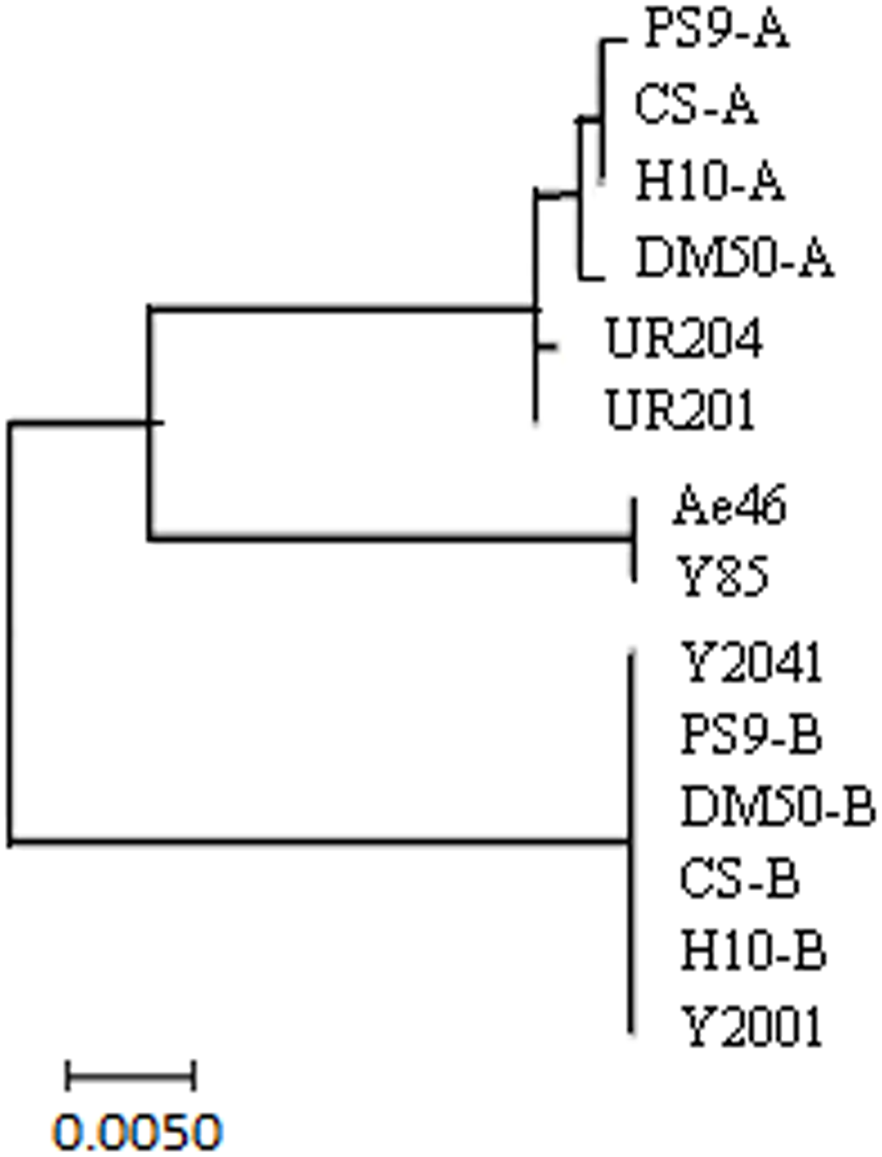 Phylogenetic analyses of TaSnRK2.8 promoters from hexaploid, tetraploid, and diploid wheats. Hexaploid wheat: Chinese Spring (CS) and Hanxuan 10 (H10); tetraploid wheat: PS9 and DM 50; A genome diploid: UR201 and UR204; B genome diploid: Y2001 and Y2041; D genome diploid: Y85 and Ae46. Phylogenetic analysis was conducted in MEGA 7.0.