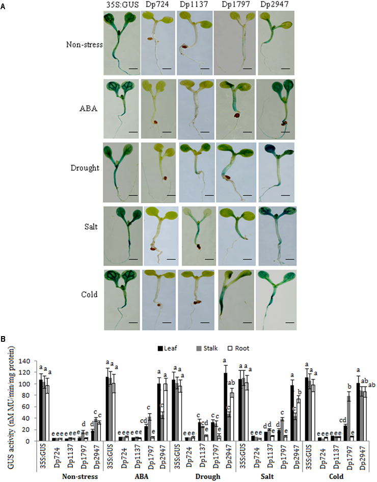 No GUS activity was observed in the Dp724 and Dp1137 plants, and only a faint expression was detected in the stalks of the Dp1797 seedlings under non-stress conditions. Although Dp2947 induced GUS expression in all tissues, weak GUS activity was observed in the leaves. These results indicated that the 660-bp segment (from position -1481 to -821) might harbor the stalk-specific expression elements under non-stress conditions, and that some enhancers were conserved in the region from position -2631 to -1481.