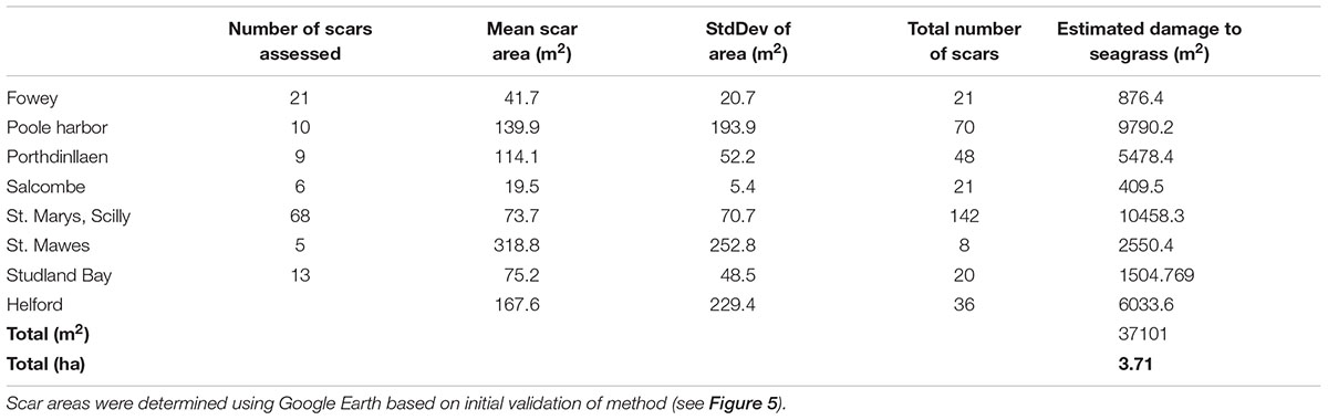 Based upon the results of this study (the validity at 5% cover for the scar area) further analysis of mooring scars using Google Earth imagery was conducted at Salcombe (Devon), Porthdinllaen (North Wales), and Poole Harbor (Dorset). At each site all moorings that could be measured using remote assessments were quantified. This was done in order to determine a site average for the area of the scar size. Additionally the total number of moorings observed remotely (but not necessarily quantified in area) known to be in an area of seagrass were determined. This information enabled a broad estimate of the total loss of seagrass at each site to be determined and then a minimal estimate for total loss across the eight sites to be calculated. Estimated seagrass loss varied from 409 m2 at Salcombe to over 1 ha at St. Marys in the Isles of Scilly (Table 3). Mean site scale loss was 4637 ± 3951 m2. The high standard deviation indicates the large variability between sites.