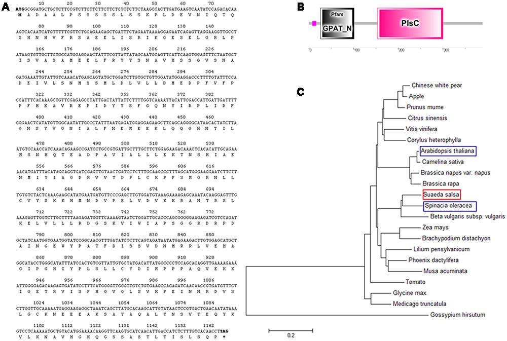 FIGURE 1. Sequence analysis of SsGPAT. Nucleotide sequences and amino acid residue sequences of SsGPAT (A), structural domain prediction of the SsGPAT protein (B); and phylogenetic relationships of amino acid residues of SsGPAT between different plants (C) are shown. The DNAman, SMART and MEGA software were used for the sequence analysis.