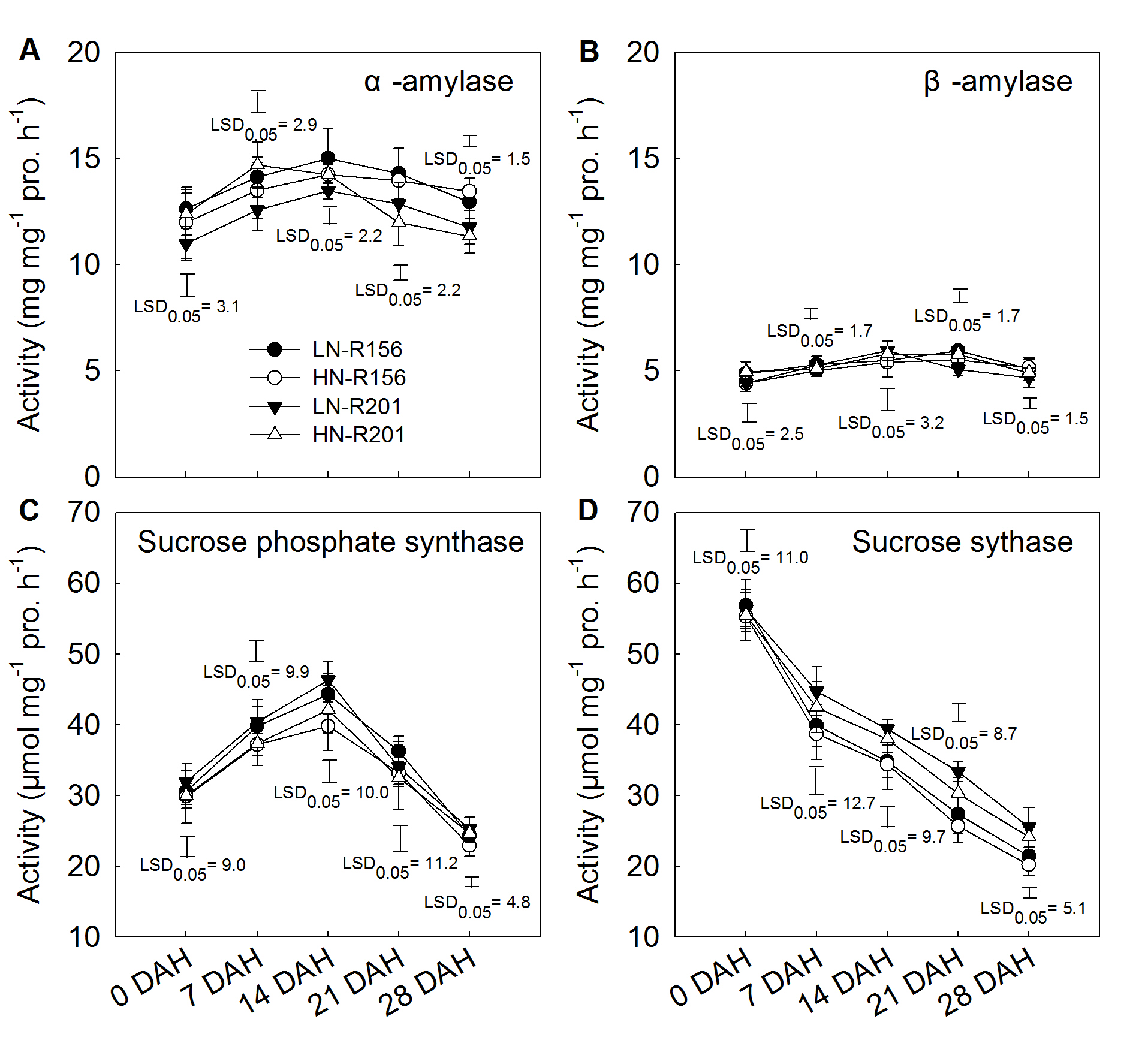 FIGURE S1 | Activities of α-amylase (A), β-amylase (B), sucrose phosphate synthase (C) and sucrose synthase in the synthetic direction (D) in stems of rice R156 and R201 under low (LN) and high nitrogen (HN) conditions during grain filling period. Vertical bars indicate LSD0.05 for comparing the means between the two lines at an identical stage. Heading date was defined as the day that 50% panicles had exserted; DAH, day after heading. Data are shown as mean ± standard error.