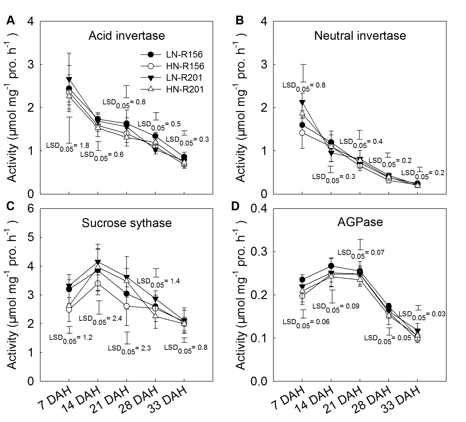 FIGURE S2 | Activities of acid invertase (A), neutral invertase (B), sucrose synthase in the cleavage direction (C) and AGPase (D) in developing grains of rice R156 and R201 under low (LN) and high nitrogen (HN) conditions. Vertical bars indicate LSD0.05 for comparing the means between the two lines at an identical stage. Heading date was defined as the day that 50% panicles had exserted; DAH, day after heading. The date of 33 DAH was the date for harvest. Data are shown as mean ± standard error.