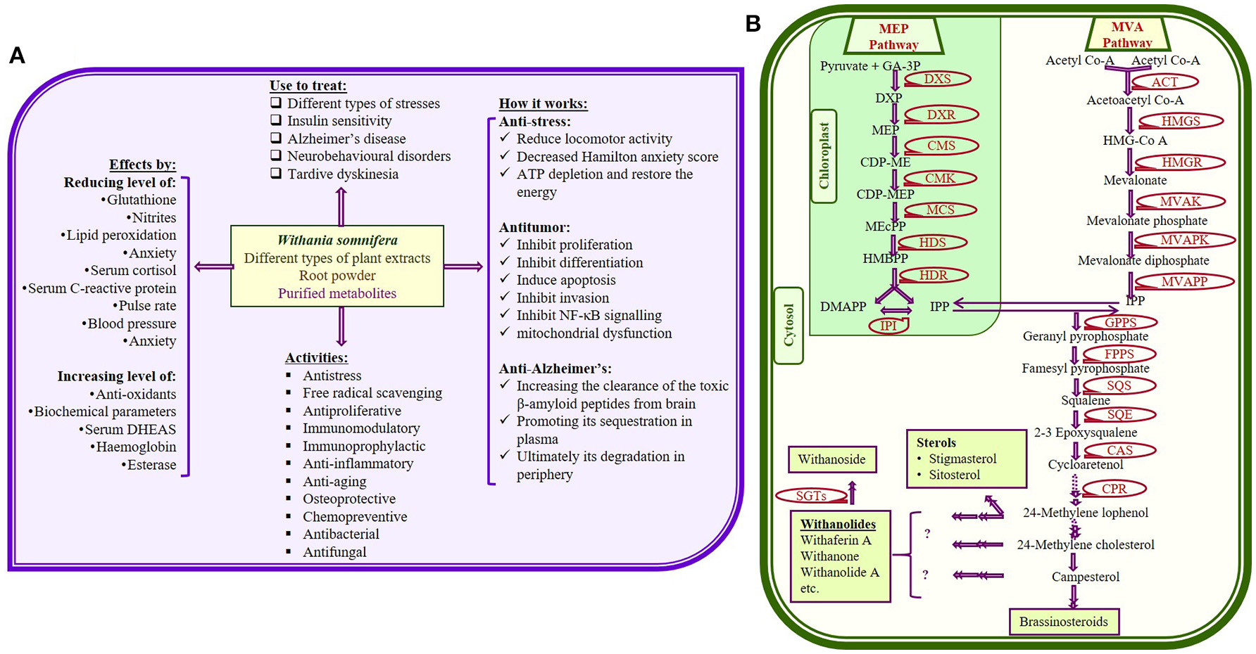 (A) Some important therapeutic uses of Withania somnifera with few proposed mode of actions (Dar et al., 2015); (B) Possible metabolic pathway for withanolides and glycowithanolides (withanosides) production (Senthil et al., 2010; Dhar et al., 2013; Sabir et al., 2013; Singh et al., 2015b) [GA-3P, glyceraldehyde-3-phosphate; MEP, 2-methyl- D-erythritol 4-phosphate; DMAPP, dimethylalyl pyrophosphate; IPP, isopentenyl pyrophosphate; IPPI, isopentenyl diphosphate isomerise; HMG-CoA, 3-hydroxy-3-methylglutaryl-coenzyme A; DXP, 1-deoxy-D-xylulose 5-phosphate; MVAPK, mevalonate phosphate kinase; MVAPP, diphosphomevalonate decarboxylase; CDP-ME, 4-diphospho-cytidyl-2-methyl-D-erythritol; CMS, 4-(cytidine-5-diphospho)-2-C-tmethyl-Derythritol synthase; CMK, 4-(cytidine-5-diphospho)-2-C-methyl-D-erythritol kinase, CDP-MEP, 2-C-methyl- D-erythritol-2-phosphate; MCS, 2-C-methyl-D-erythritol-2,4-cyclodiphosphate synthase; HDS, Hydroxy methyl butenyl 4- diphosphate synthase; HMBPP, Hydroxy methyl butenyl 4-diphosphate; HDR, Hydroxy methyl butenyl 4-diphosphate reductase].