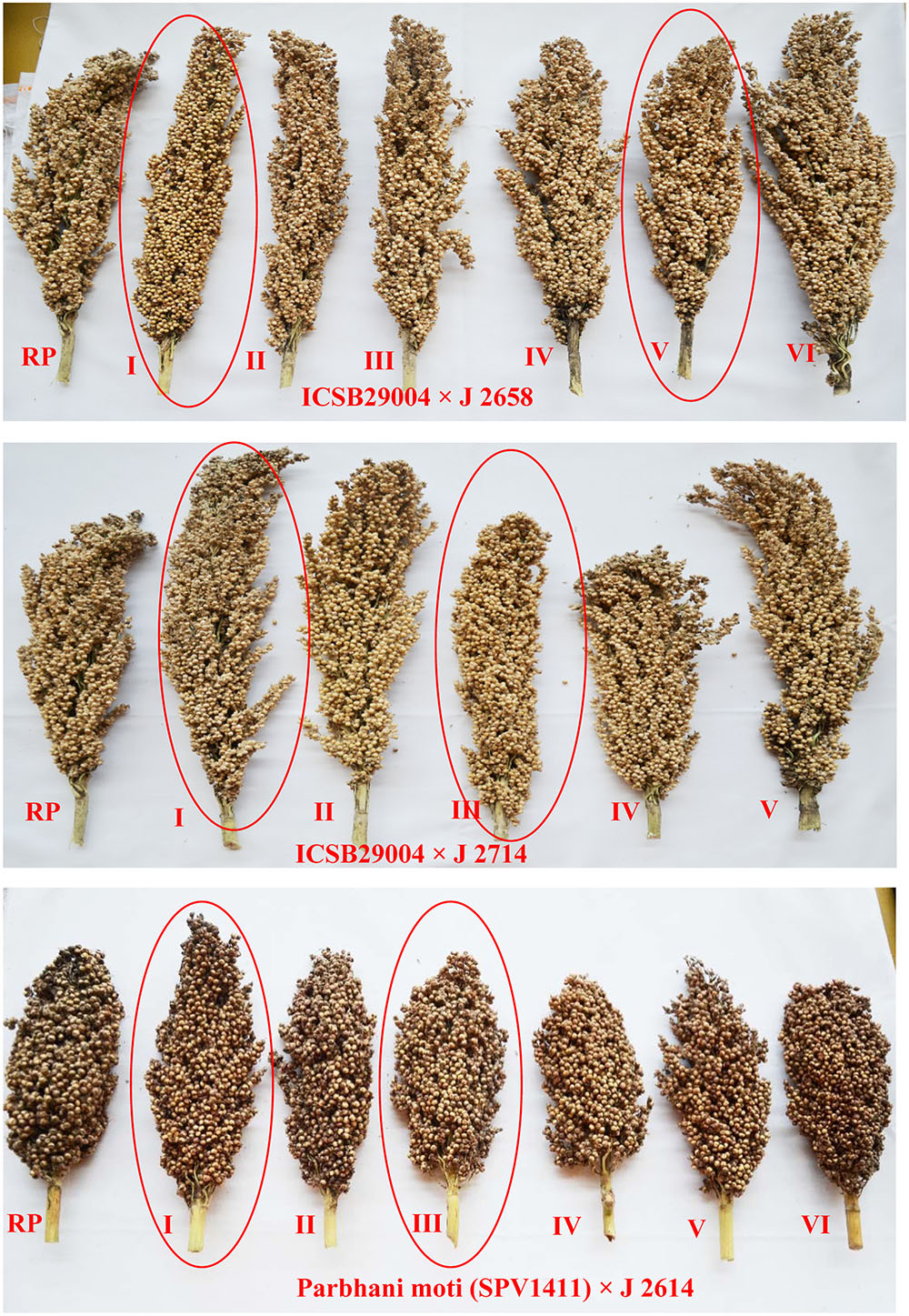 FIGURE 7. Mature sorghum panicles of introgressed lines along with recurrent parents. Panicles in red circles are selected lines for shoot fly resistance.