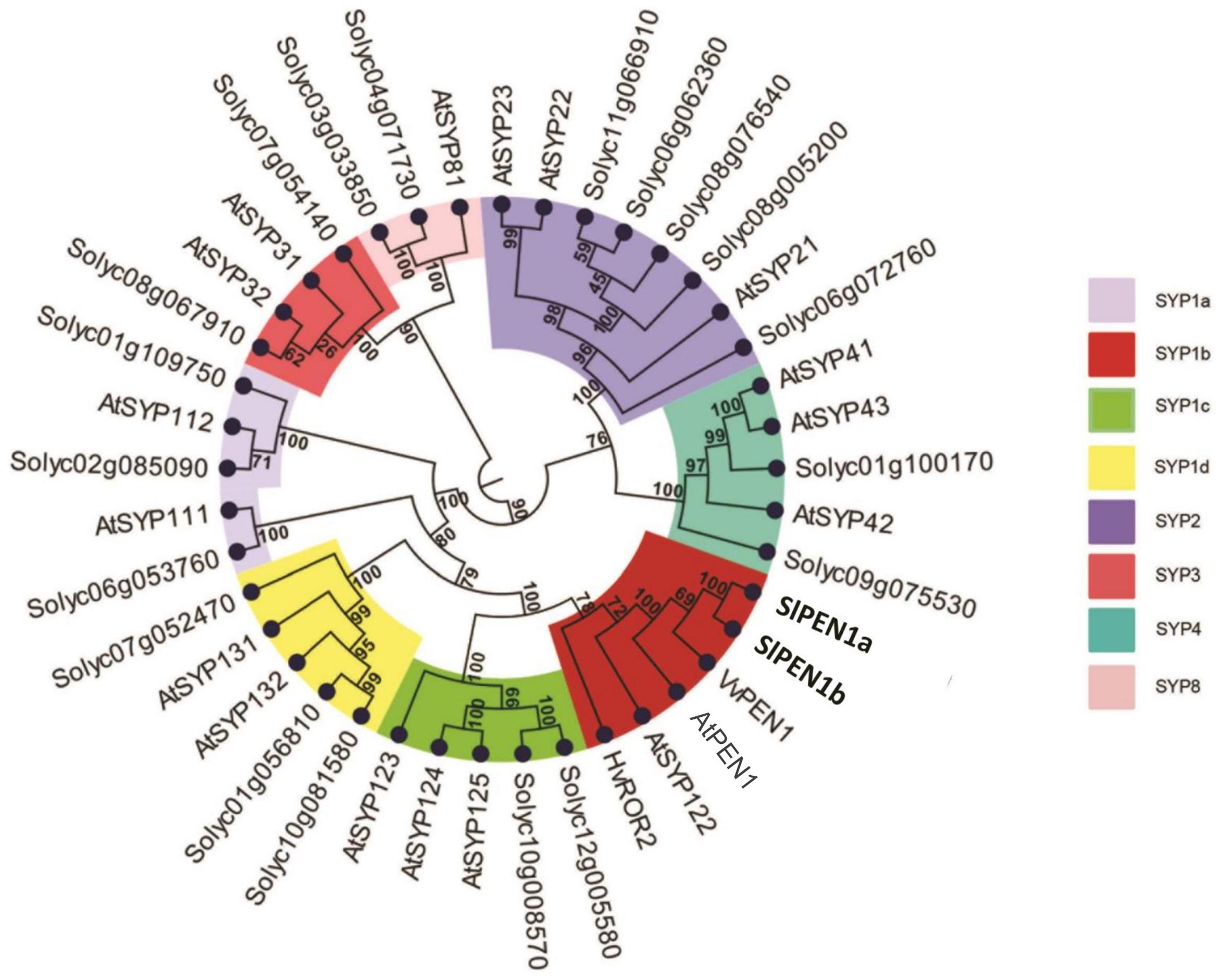 Twenty-one putative syntaxins were retrieved in the tomato genome with a BLAST search using the Arabidopsis AtPEN1 amino acid sequence as input. These were used for a phylogenetic study, together with the 18 Arabidopsis syntaxins, barley HvROR2 and grapevine VvPEN1. The resulting phylogenetic tree was composed by five clearly distinct clades (Figure 1). The distribution of Arabidopsis syntaxins within the clades fully matched with their previous assignment to the five subfamilies SYP-1, -2, -3, -4, -8 (Sanderfoot et al., 2000). Within each clade, at least one tomato putative syntaxin was found. The most represented clade (SYP-1), harboring 21 homologs, was further partitioned into four subclades (indicated as SYP-1a to -1d in Figure 1).