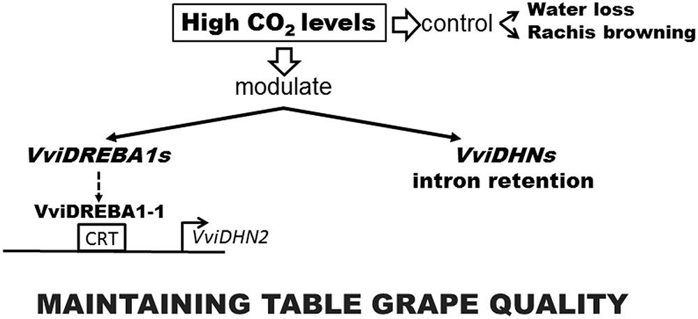 Overall, our results demonstrated that the 3-day gaseous treatment was effective in maintaining table grape quality regardless of the cultivar and modulated the expression of VviDREBA1s transcription factors in a tissue dependent way. Furthermore, the application of high levels of CO2 regulated the retention of introns in the transcripts of the dehydrins in a different manner and in all the tissues analyzed. On the other hand, VviDREBA1-1 was the only transcription factor analyzed that presented in vitro binding capacity to the CRT element of the VviDHN2 promoter region, indicating that the transcriptional regulation of VviDHN1a and VviDHN4 would be carried out by activating other independent routes of these transcription factors (Figure 7). These results, together with the fact that VviDREBA1-1 gene expression was induced by high CO2 levels in the skin of Autumn Royal fruit and in the pulp and rachis of Cardinal bunches (Fernandez-Caballero et al., 2012), make this transcription factor a good candidate for further research with the aim of improving table grape quality.