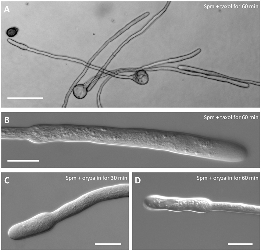 Figure 6. Co-treatment of pear pollen tubes with Spm and microtubule inhibitors. (A) DIC view of pollen tubes after co-treatment with Spm and taxol. (B) Detail of a single pollen tube after Spm+taxol treatment (DIC view). (C,D) DIC views of pollen tubes after co-treatment with Spm and oryzalin. Neither inhibitor affected the formation of the shovel shape. Images were captured after the incubation time indicated in each picture. Both analyses were performed at least until 1 h after supplementation of Spm and drugs. Bar in (A) 100 μm; bars in (B–D) 20 μm.