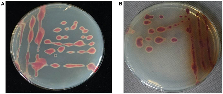 Figure 2. Morphology of R. solanacearum biovar 3 isolate RS348 (A) and biovar 4 isolate RS371 (B) on TZC medium plates.