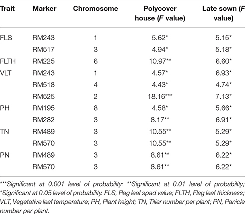 The list of 11 common marker-trait associations found only under heat stress and in both wet and dry seasons involving nine markers and six traits is shown in Table 3. RM 243 was associated with both FLS and VLT whereas RM517 was associated only with FLS. RM518 and RM525 were also associated with VLT. RM225 was associated with FLTH and RM185 and RM282 were associated with plant height. Both panicle number and tiller number were associated with two common markers, RM489 and RM570. In addition to these common associations, there were 67 unique significant marker-trait associations only in WH, out of which more associations were with FLS (15) and VLT (11). Similarly, there were 58 unique significant marker-trait associations in DH, out of which more associations were with VLTH (13). In WH, only four unique associations (with markers RM 183, 332, 401, and 3735) were observed with YPP whereas there was only one unique association with YPP (with RM210) in DH.