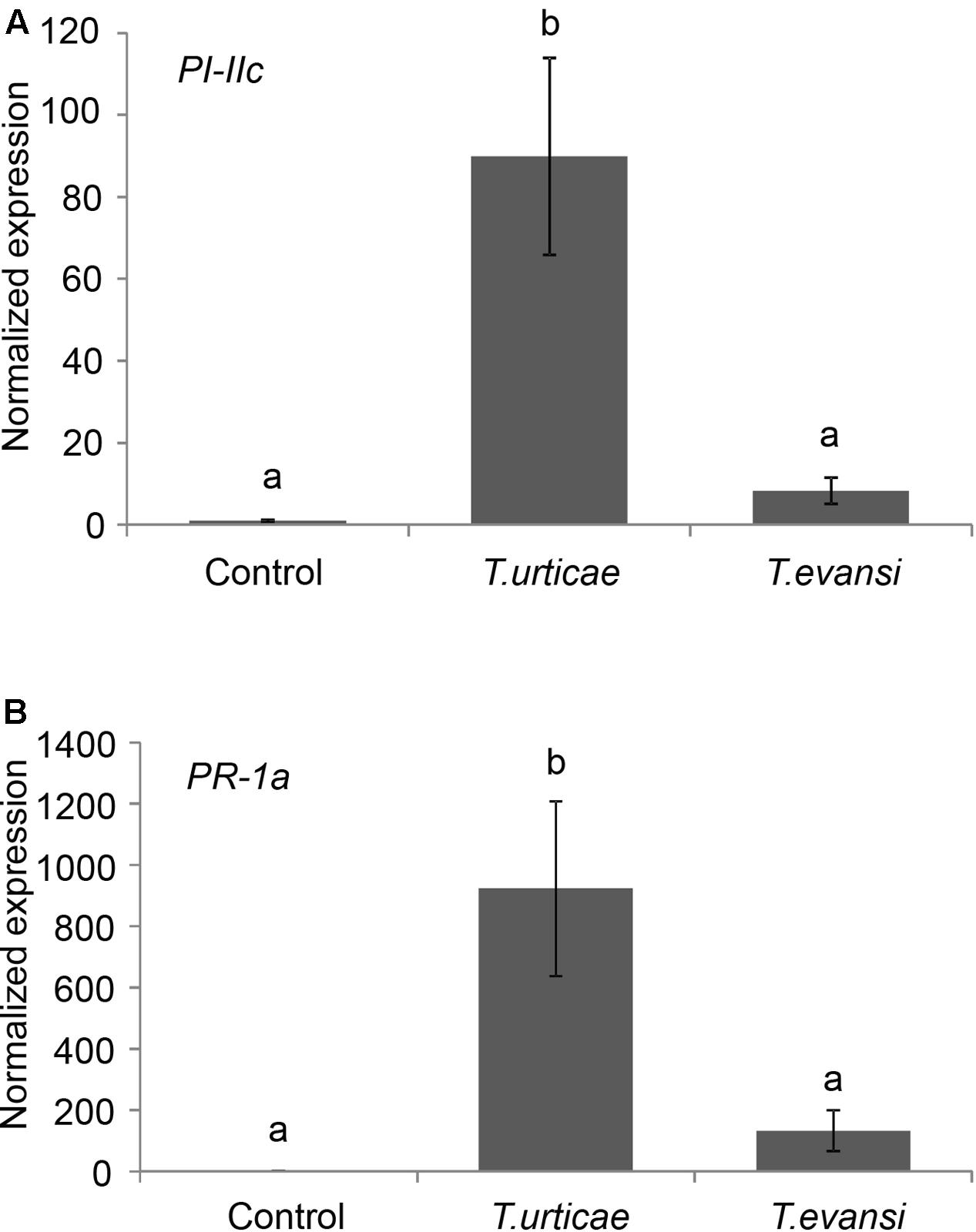FIGURE 1. Relative transcript abundances of defense-related genes in Tetranychus evansi and Tetranychus urticae infested Micro-Tom leaflets at 7 days post-infestation. PI-IIc (A) and PR-1a (B) transcript levels were relative to actin. Uninfested leaflets were used as controls. The bars represent the means ( ± SE) and are scaled to the lowest mean by putting this to 1. Bars annotated with different letters were significantly different according to Fisher’s LSD test (P < 0.05) after ANOVA, n = 5.