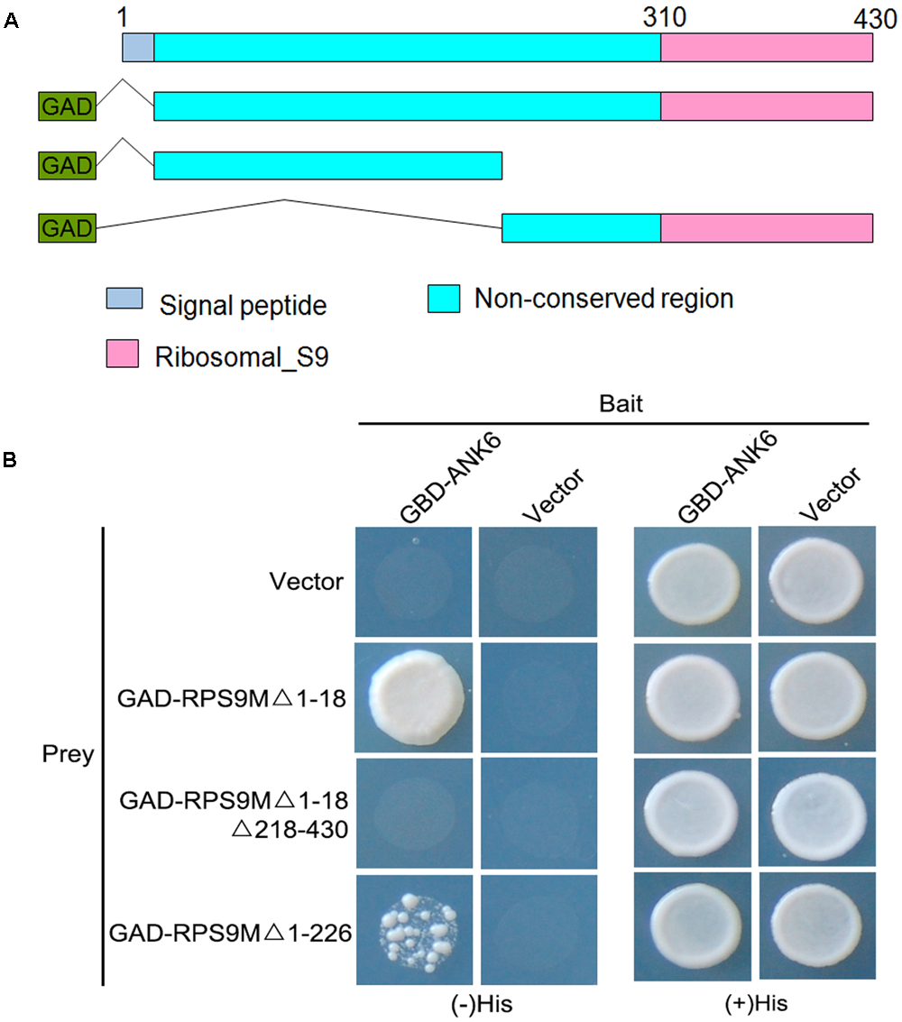Interaction between RPS9M and ANK6 determined by Y2H analysis. (A) Diagram of the full-length and truncated RPS9M constructs with specific deletions. (B) Y2H analysis of ANK6 interacting with full-length and truncated RPS9M.
