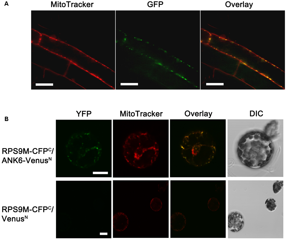 The ORF sequence of ANK6 and RPS9M was cloned into the plasmid pE3308 and pE3449 using the primer pairs list in Supplementary Table S2. Protoplasts were isolated from 4 week old Arabidopsis rosette leaves. Transient protoplast expression was performed using the polyethylene glycol transformation method as described previously (Sheen, 2001).